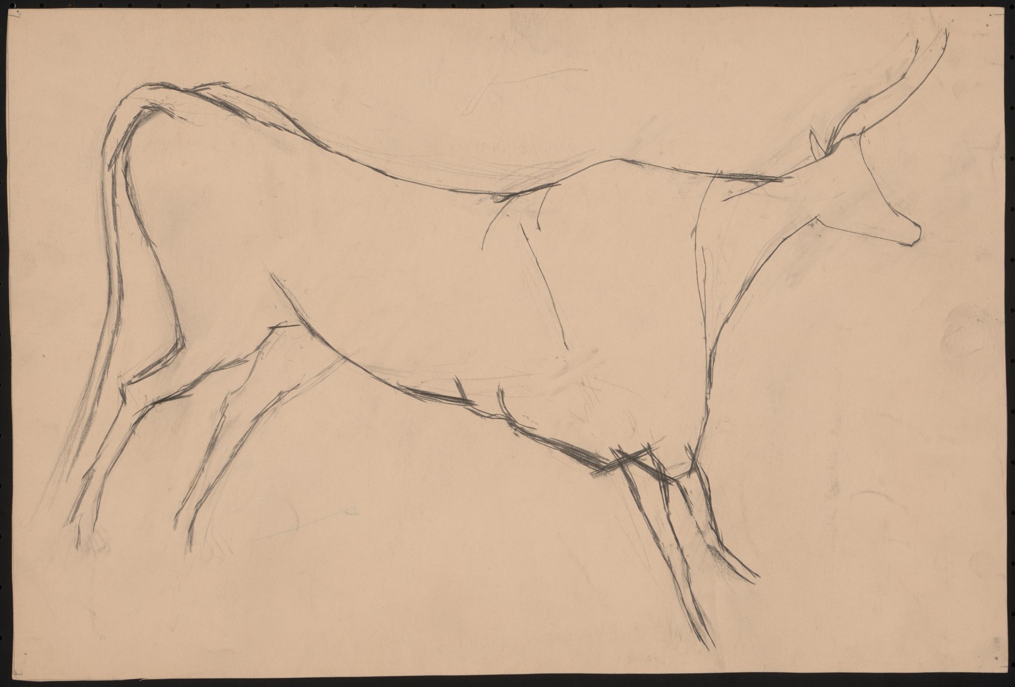 Animal de type bovidé représenté dans le style des peintures préhistoriques, pour illustrer la création des animaux.