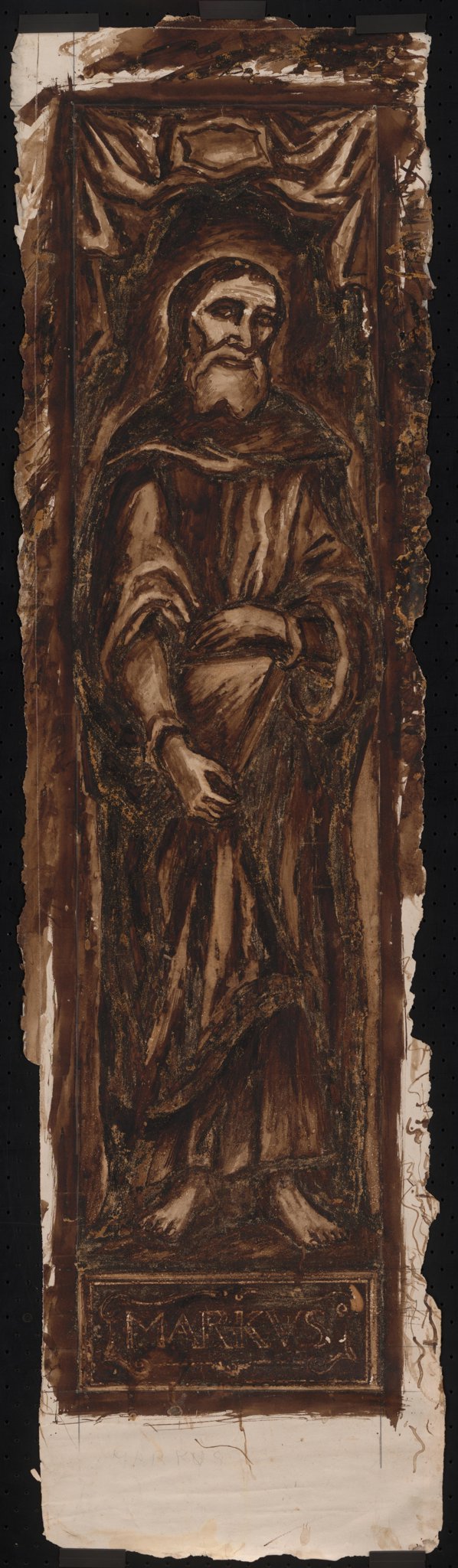 Ce travail préparatoire a été réalisé par Marcel Poncet dans le cadre de la commande de quatre vitraux des Evangélistes pour la Reformierte Kirche de Schlieren (Zurich), réalisés en 1937. Poncet obtient cette commande par l'intermédiaire de l'architecte de l'édifice, Walter Henauer (1880-1975), qu'il a rencontré à l'occasion de ses séjours parisiens. Suite à la pose des vitraux, il propose pour cette même église un projet de carte du ciel (représentations du zodiaque, des planètes et leurs personnifications), qui est refusé par la commission, pour des raisons avant tout financières (REYMOND, 1992, pp. 70, 170 ; "Neue reformierte Kirche in Zürich-Wollishofen und neue Kirche und Renovation der alten Kirche in Schlieren : Architekten W. Henauer & E. Witschi SA, Zürich.", 1938, pp. 297-304).