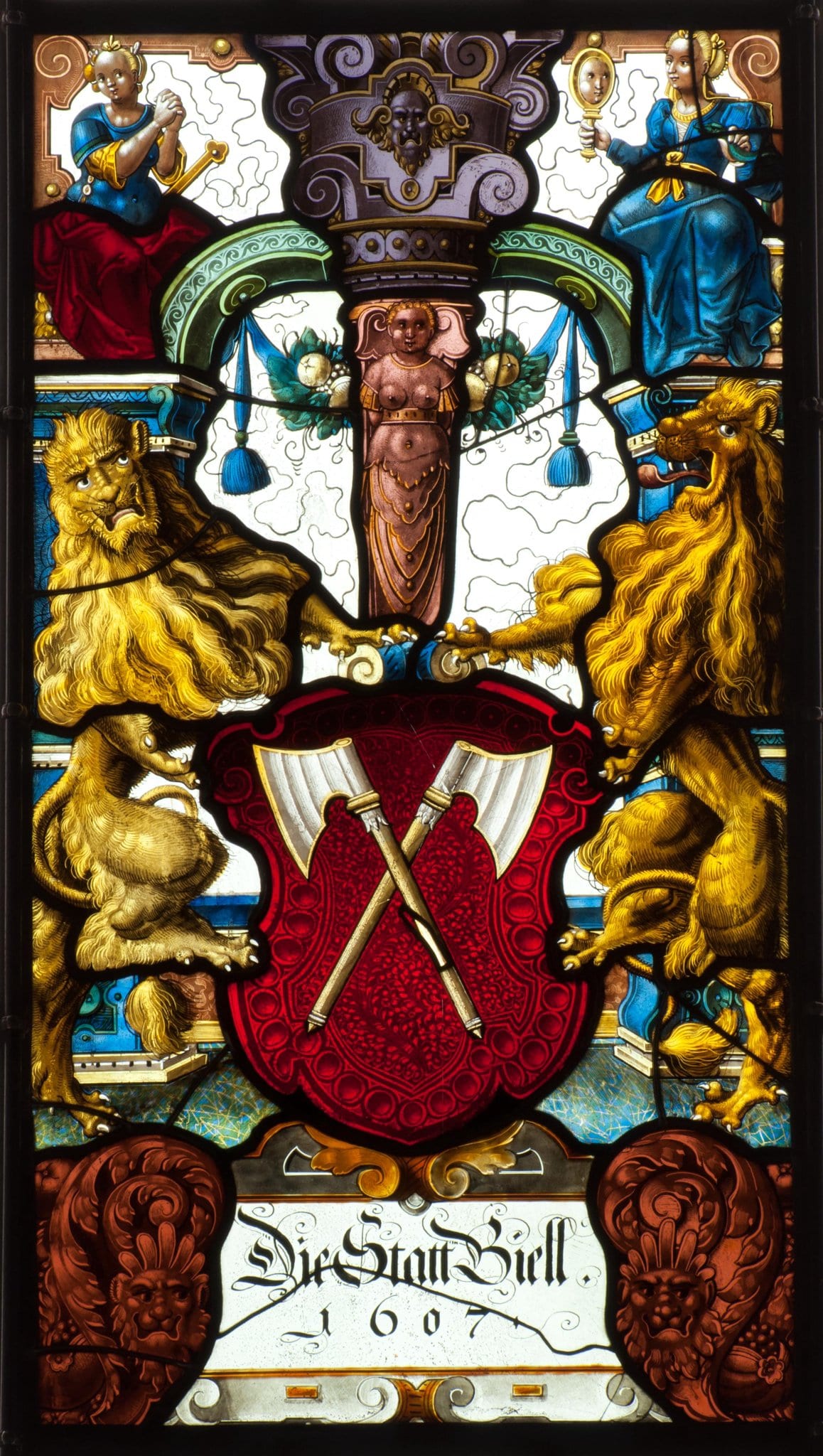 Das Bieler Stadtwappen wird von zwei Löwen gehalten. Diese verdecken fast vollständig die sich dahinter vor farblosem, schnurverziertem Grund erhebenden blauen Pfeiler. Der darauf ruhende grüne Bogen fusst in der Mitte auf einem rosa Hermenpfeiler, auf dem ein violetter Kartuschenaufsatz mit zentraler Maske ruht. Zu dessen Seiten sitzen auf den Pfeilern zwei allegorische Frauengestalten. Während sich die Figur rechts im langen blauen Gewand anhand von Spiegel und Schlange in ihren Händen eindeutig als die Klugheit zu erkennen gibt, dürfte ihre Kollegin links im roten Rock aufgrund ihrer gefalteten Hände die Hoffnung verkörpern. Demnach wäre der hinter ihr hervorragende Stab mit Kleeblattende die Spitze des Ankers, ihres gängigen Attributes. Die Kartusche mit der Stifterinschrift am Scheibenfuss wird von lachsfarbenem, mit Löwenmasken geschmücktem Blattwerk gerahmt.