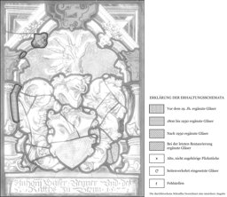 Kleinere neue Ergänzungen im linken Teil der Rahmung; geringe Korrosions- und Bemalungsschäden; die Inschrift stellenweise retuschiert; mehrere Sprungbleie und einige Sprünge; die Verbleiung erneuert.