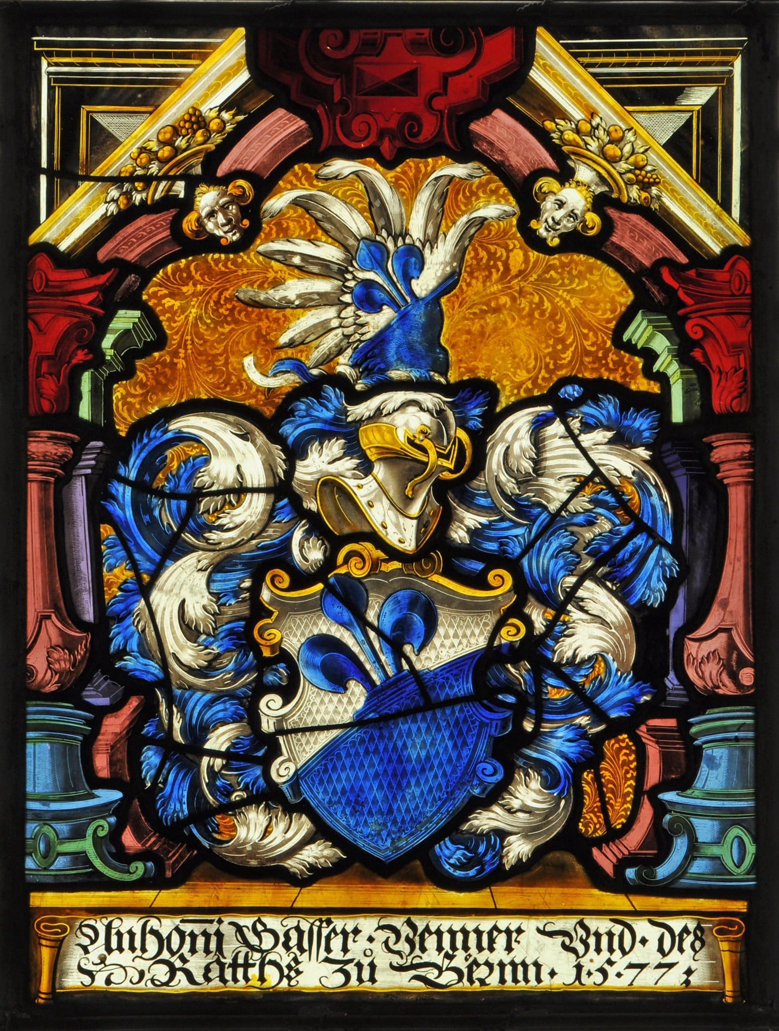 Die Scheibe Anton Gassers stammt sicher von der gleichen Hand wie die gleichzeitige Scheibe Johann Anton Tilliers in Aarwangen. In der grossen breiten und kräftigen Schrift unterscheiden sich beide von den anderen Scheiben aus der Zeit des Kirchenbaus. Ihr Schriftcharakter schliesst sie zudem eng an die Scheibe Niklaus Manuels des Jüngeren im Berner Münster an, die von Hans Hübschi 1582 signiert wurde (Kurmann-Schwarz 1998, Abb. 307/308). Auch die Rollwerktartsche mit dem ausgeprägten goldenen Rand ist bei allen drei Scheiben gleich. Man darf Hans Hübschi somit als Schöpfer für die Scheiben Gasser und Tillier in Betracht ziehen.