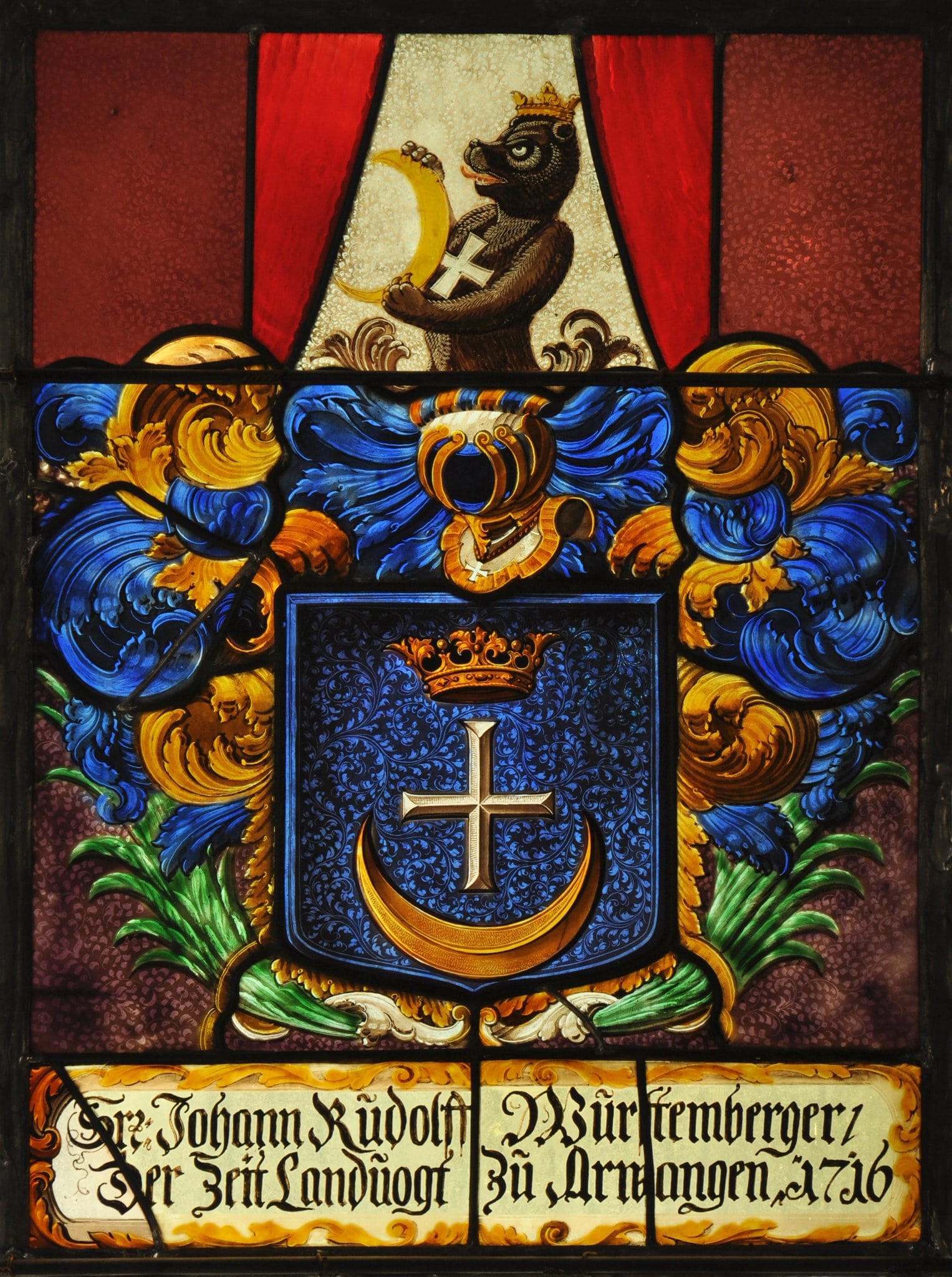 Das Vollwappen Johann Rudolf Wurstembergers erscheint vor fein gefiedertem Damastgrund, der in der unteren Zone violett, in den oberen Aussenfeldern bräunlichrot und hinter dem Helmkleinod hellgelb gefärbt ist. Das Bärenkleinod wird seitlich von einem zurückgezogenen roten Vorhang gerahmt. Unter dem Wappen nimmt eine blattumkränzte Tafel die Stifterinschrift auf.