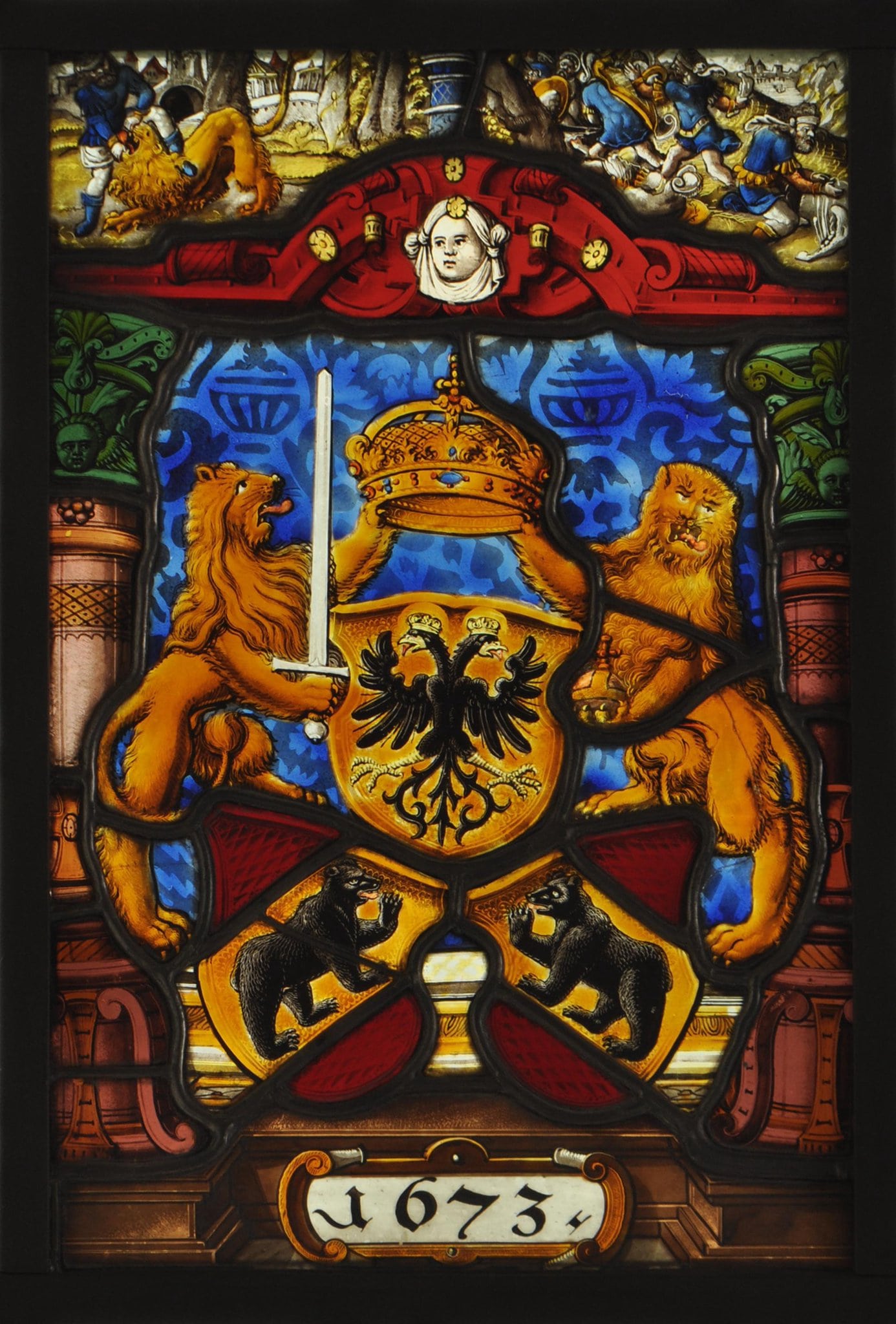 Vor blauem Damastgrund ist die Wappenpyramide Bern-Reich aufgebaut. Darüber halten die zwei schildbegleitenden, mit Schwert bzw. Reichsapfel ausgestatteten Löwen die Krone empor. Als Rahmenarchitektur dienen zwei hellrosa Rundpfeiler mit grünen, engelskopfgeschmückten Kapitellen und ein eingezogener roter Rundbogen mit einer Frauenmaske im Giebel. Im zurückversetzten Mittelteil des hellbraunen Rahmenunterbaus steht das Stiftungsjahr in einer gelben Rollwerkkartusche. Das Oberbild schildert zwei Begebenheiten aus dem Leben Simsons. Links erlegt dieser den Löwen, und rechts erschlägt er die Philister mit dem Eselskinnbacken(Richter 14, 15).