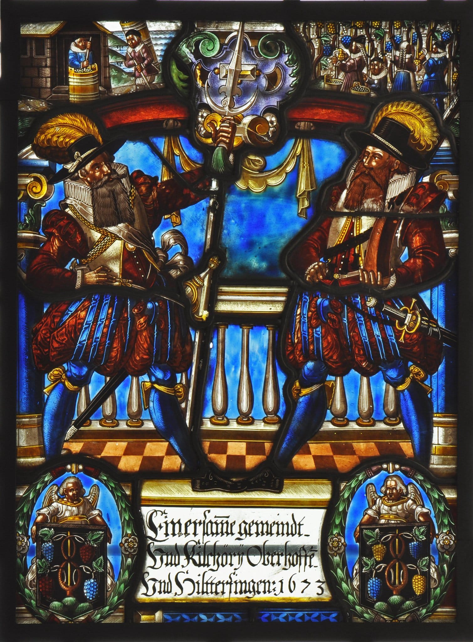 Vor einer Balustrade und einem wolkig blauen Hintergrund stehen breitbeinig ein Halbartier und ein Büchsenschütze. Die beiden vollbärtigen und schwertbewaffneten Männer tragen je ein braunrotes Hemd mit Halskrause, ein kurzärmeliges Wams, blau und rotbraun gestreifte Pluderhosen und blaue Strümpfe sowie auf dem Haupt einen schwarzen Federhut. Hinter ihnen erhebt sich auf braun-gelbem Fliesenboden ein von blauen Pfeilern gestützter braunroter Flachbogen mit violetter Scheitelkartusche. In den Zwickelfeldern darüber sind die Einwohner Oberhofens und Hilterfingens bei der Weinlese im Rebberg sowie beim Einbringen der Traubenernte am Ufer des Thunersees dargestellt. Die Stifterinschrift am Scheibenfuss flankiert je ein ovales Kranzmedaillon mit den von einem Engel präsentierten Wappen von Oberhofen und Hilterfingen.