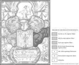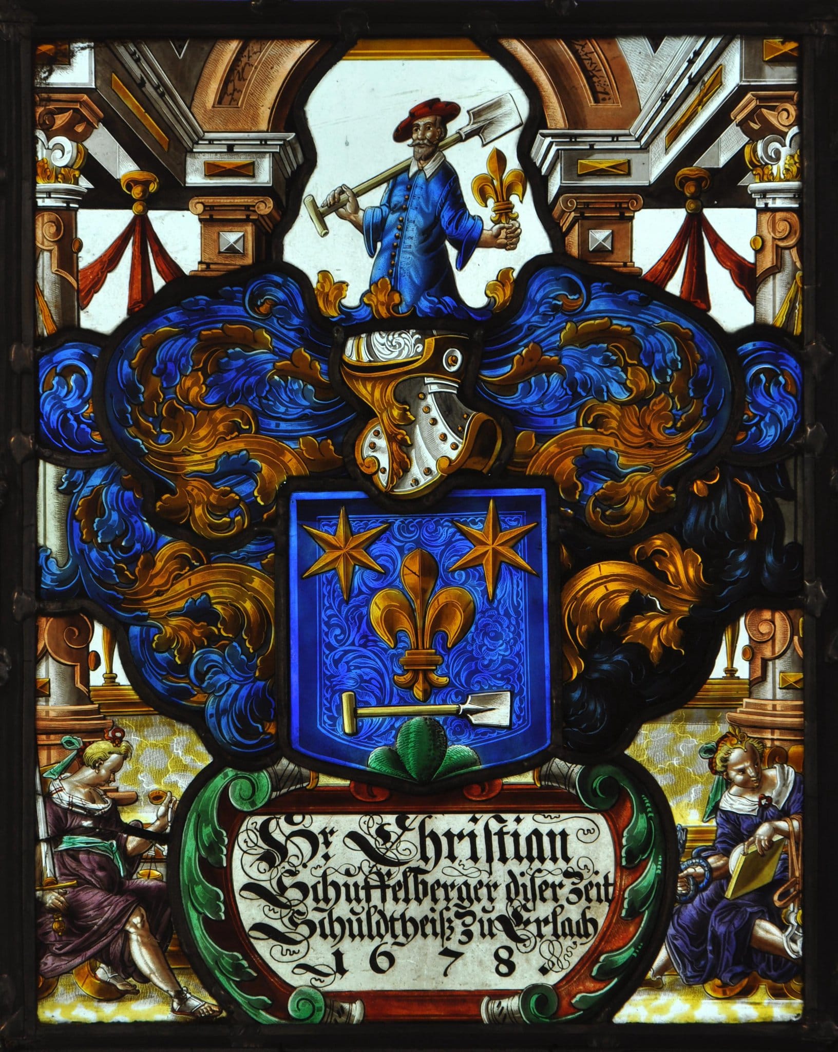 Vor farblosem Grund ist das Vollwappen Christian Schaufelbergers über die rot-grüne Rollwerkkartusche mit der Stifterinschrift gesetzt. Dahinter erhebt sich zwischen einem verkürzten, auf Säulen ruhenden Gebälk ein die Helmzier rahmender, gelbbräunlicher Rundbogen. In den unteren Bildecken sitzen auf gelb-grau marmoriertem Steinboden zwei allegorische Frauengestalten in violetten Gewändern, links die Gerechtigkeit (Justitia) und rechts die Klugheit (Prudentia).