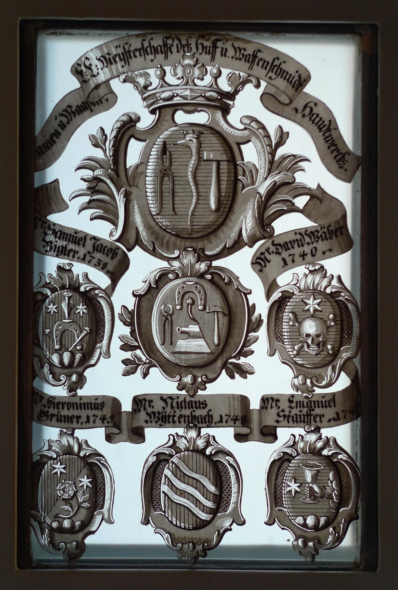 Von den zehn Grisaillescheiben ist die älteste, diejenige von 1739, eine signierte Arbeit Samuel Küpfers (1712–1786). Dass dieser auf die Anfertigung von Grisaillescheiben spezialisierte Berner Glasmaler um die Mitte des 18. Jahrhunderts die ganze in Glas gebrannte Wappenserie für das alte Gesellschaftshaus schuf, ist aufgrund ihrer Einheitlichkeit nicht zu bezweifeln.