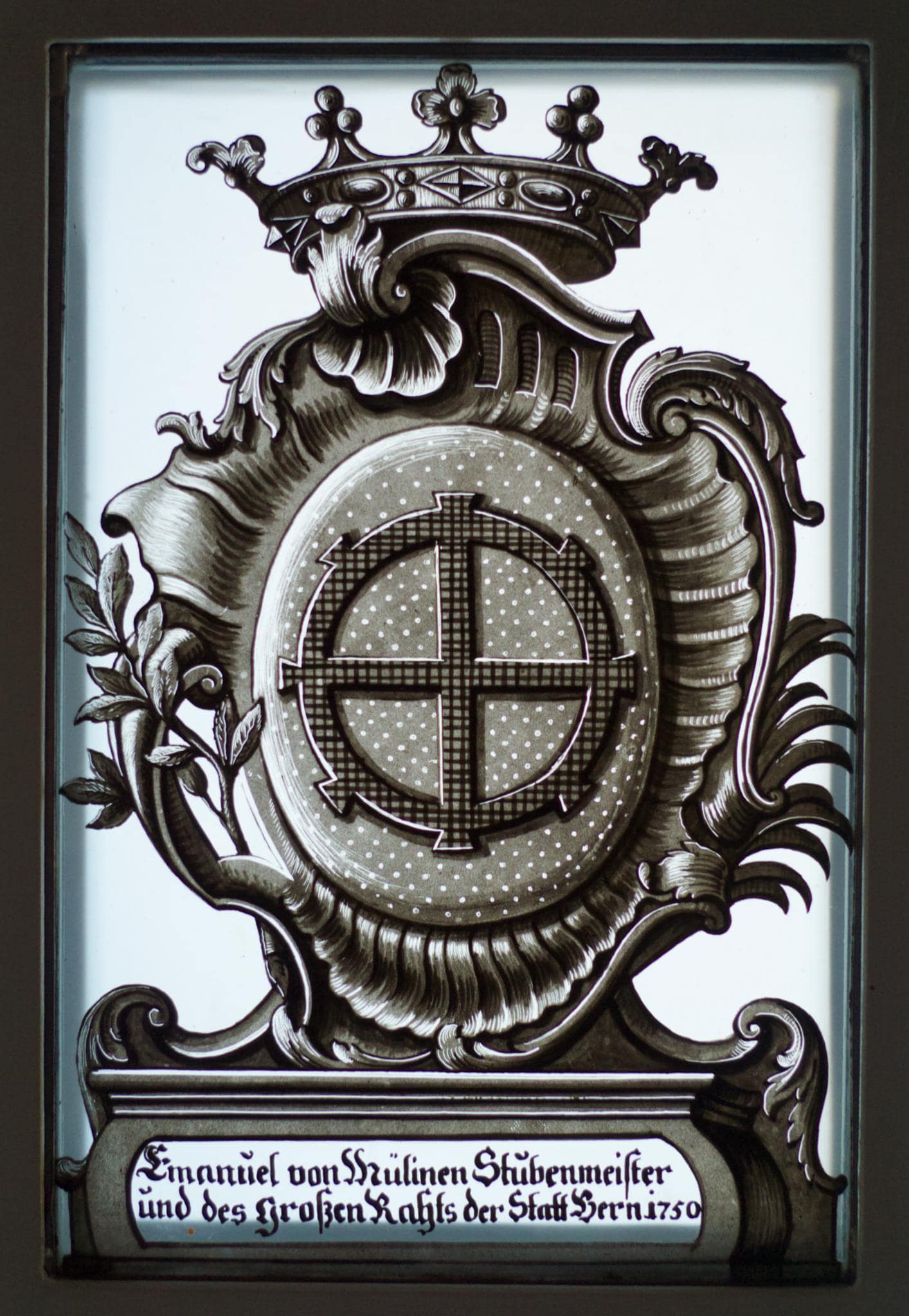Das 1912 abgebrochene Zunfthaus der Berner Gesellschaft zu Schmieden an der Marktgasse wurde ab 1718 über Jahre grundlegend erneuert. Zu den letzten Umbauphasen zählte die 1748 erfolgte Einsetzung neuer Fenster in die vordere "façe" des Gesellschaftshauses. Dabei erbat man sich zum Schmuck der Fenster von den zur Zunft gehörenden Meisterschaften "einiche Lichter samt den Schilten". Laut Paul Wäber kamen in der Folge die Meisterschaften des Kupferschmied-, Hufschmied- und Messerschmiedhandwerks der Aufforderung nach und schenkten je ein Fenster mit ihrer "Schliffscheibe" (Wäber 1938). Bei diesen Schenkungen handelte es sich freilich nicht um Schliffscheiben, sondern um Glasgemälde in Grisaillemalerei. Unter den heute erhaltenen drei Meisterschaftsscheiben findet sich zudem keine des Messerschmiedhandwerks. Vielmehr sind es zwei Stiftungen des Huf- und Waffenschmiedhandwerks von 1739 und 1748 sowie diejenige der Kupferschmiede von 1749. Die Huf- und Waffenschmiede hatten das Gesellschaftshaus demnach bereits bei einer früheren Umbauphase mit einem Glasgemälde beehrt. Die Stiftung der Messerschmiede hingegen dürfte beim Unwetter (Hagelschlag) gegen Ende des 19. Jahrhunderts zerstört worden sein (s. u.). Ausser den drei Glasgemälden der Meisterschaften existieren aus der gleichen Periode sieben weitere Grisaillescheiben mit den Wappen von Gesellschaftsangehörigen. Nach Paul Wäber erfolgten diese Stiftungen, nachdem die Zunft, das heisst die "Committierten zu den Gesellschaftsfenstern", 1750 ein jedes "Ehrenglid" der Waisenkommission um sein Wappen für ein Fenster gebeten hatten. Von den betreffenden Scheiben datieren allerdings lediglich zwei von 1750 und 1751, die restlichen fünf jedoch aus den Jahren zwischen 1745 und 1749. Es ist deshalb davon auszugehen, dass die Zunft bereits gegen 1745 mit der Bitte um Wappengaben an einzelne ihrer Angehörigen gelangt war. Wie viele solche Gaben die Gesellschaft zu Schmieden damals in ihr erneuertes Haus erhielt, weiss man zwar nicht. Es werden aber sicher mehr als die heute noch vorhandenen zehn Glasgemälde gewesen sein.