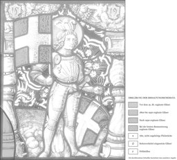 Eingeritzte Jahresinschriften im Damaststück unten links (1814, 182..., 1829, 1919) und neue Inschrift im Rasenstück unten links.