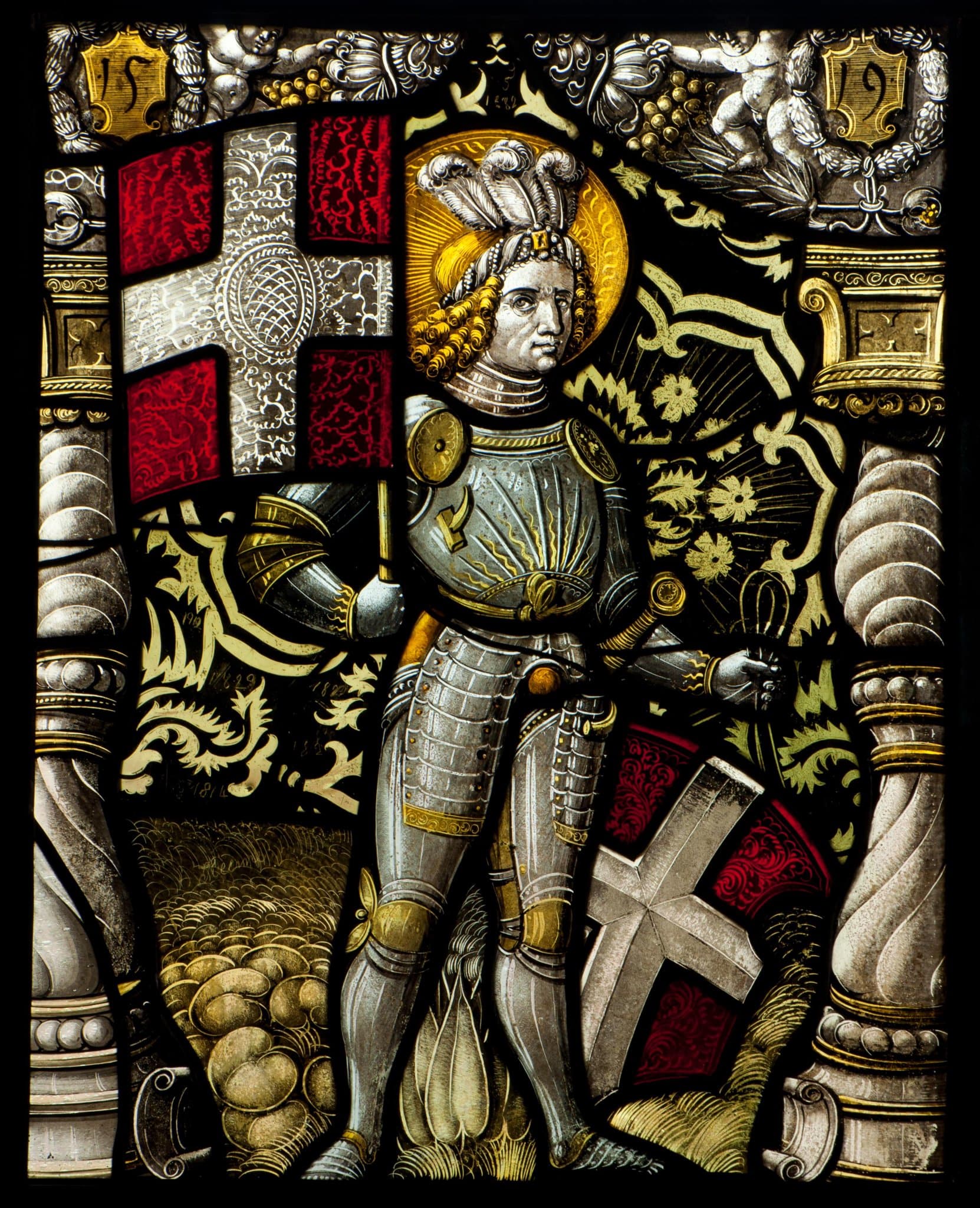 Solothurns Standespatron, der hl. Ursus, erscheint stolz posierend auf gelbem Wiesenboden vor schwarz-gelbem Damastgrund. Er ist in einen grauen Vollharnisch gekleidet und hält in der angewinkelten Rechten sein Banner sowie in der Linken an einer Fessel seinen Wappenschild mit dem durchgehenden silbernen Kreuz in Rot. Die Seitenrahmung bilden zwei fantasievolle Steinpfeiler. Über ihren Kapitellen halten zwei Putten eine bogenförmig geschwungene Girlande aus Blättern und Früchten empor. Hinter diesen Putten ist in zwei umkränzten Schilden das Stiftungsjahr festgehalten.