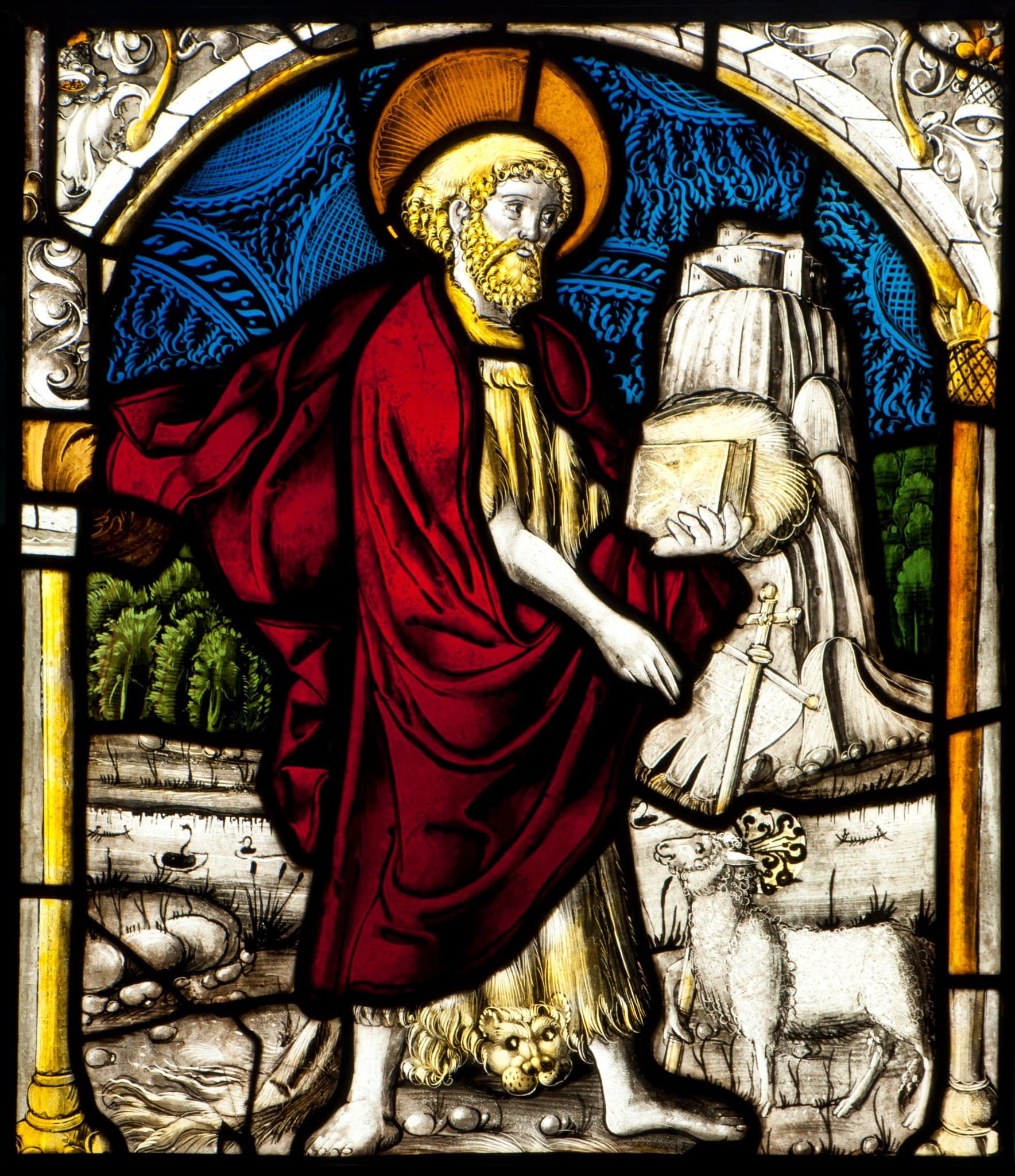 Johannes der Täufer steht vor einer bewaldeten Landschaft am Ufer eines Flusses, an dem sich eine Burg auf einem hohen pyramidenförmigen Felsenhügel befindet. Der Heilige ist in ein kamelhärenes Hemd mit einer Löwenfratze am Saum und einen leuchtend roten Mantel gekleidet. Während er in seiner Linken ein Buch hält, weist er mit der Rechten auf das mit einer Kreuzfahne ausgestattete Gotteslamm zu seinen Füssen. Die Komposition rahmt eine schlichte Arkade mit gemauertem Flachbogen, über dem Rankenwerk die Zwickel füllt.