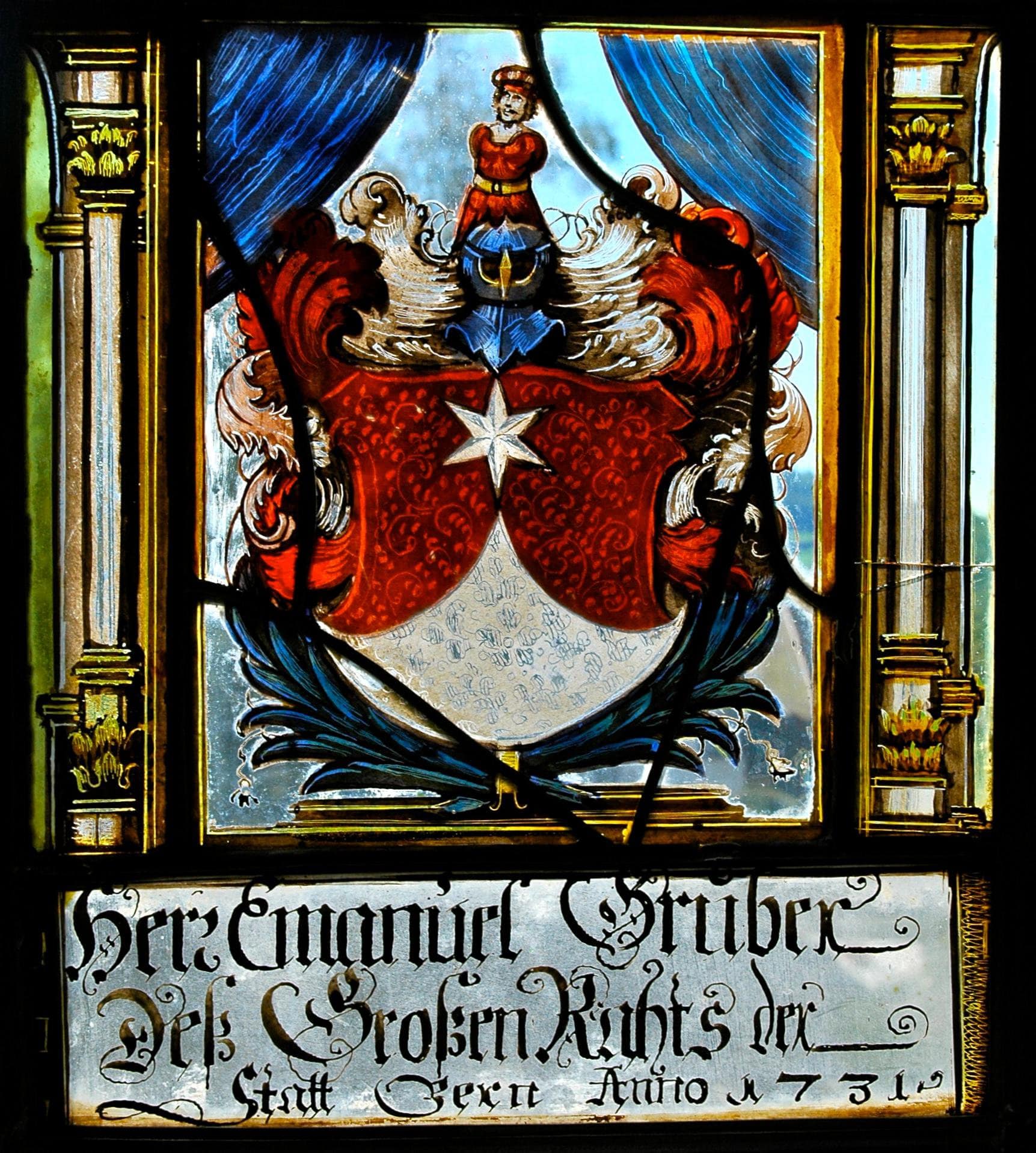 Emanuel Grubers Wappenstiftung entspricht im Grundschema dem Glasgemälde Barbara Elisabeth Kirchbergers, zu dem vormals nachweislich ein Pendant mit dem Wappen ihres Mannes Albrecht von Mülinen vorhanden war. Auch zur Scheibe Emanuel Grubers existierte ursprünglich ein solches Pendant mit dem Wappen seiner Gemahlin Rosina Esther Stettler. Von diesem 1896 noch in der Kirche befindlichen (vgl. Thormann/von Mülinen), heute aber verschollenen Glasgemälde mit der Stifterinschrift "Und Frauw Rosina Ester Stettler Sei Ehgemalin Anno 1731" gibt es eine Pause von Hans Drenckhahn in dessen Nachlass im Vitrocentre Romont (Mappe 252).