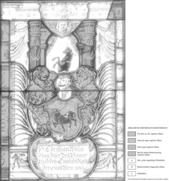 Das von zwei grünen Palmzweigen umkränzte Vollwappen Christian Willadings steht auf der Rollwerkkartusche mit der Stifterinschrift. Diese ist dem mit einem violetten Tuch dekorierten Postament vorgesetzt. Hinter dem Wappenschild erheben sich vor farblosem Grund zwei reich geschmückte Säulen mit einem eingestellten violett marmorierten Rundbogen, der mit einem Vorhang und am Scheitel mit einem geflügelten Engelskopf geschmückt ist. Seitlich wird die Scheibe durch zwei einfache braune Randleisten gerahmt, die oben durch einen blauen Vorhang mit den inneren Säulen verbunden sind. Weil sie zu klein war, wurde die Scheibe nachträglich zu beiden Seiten und oben erweitert, indem man ihr eine in Grisaille- und Silbergelbmalerei ausgeführte Architekturrahmung mit einer Maskenkartusche im Gebälk anfügte (s. u.).