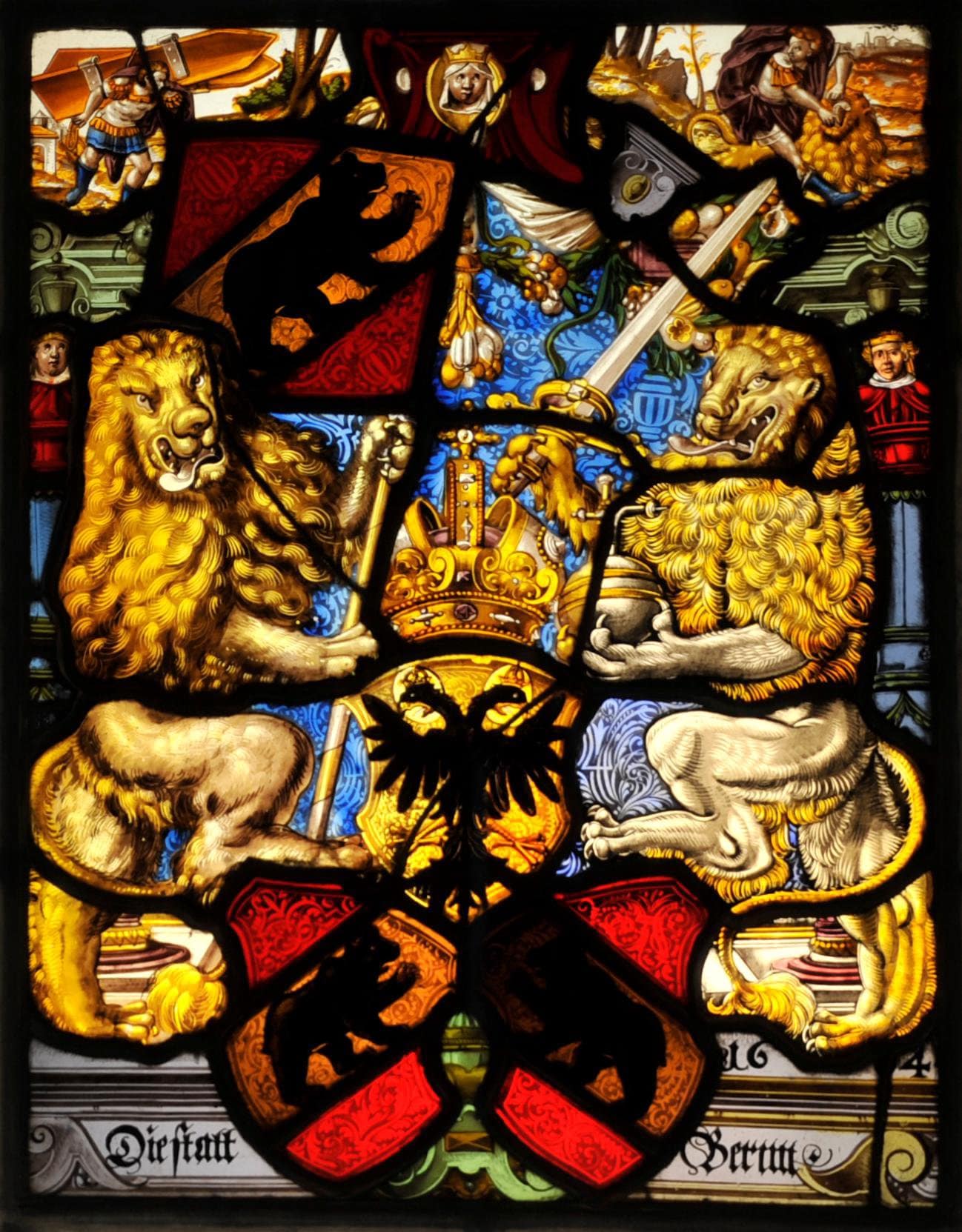 Vor dem Podium mit der Stifterinschrift erhebt sich die bekrönte Wappenpyramide Bern-Reich. Sie wird von zwei vor blauem Damastgrund auf dem Podium stehenden, in ihren Vorderpranken das Berner Banner beziehungsweise Reichsschwert und Reichsapfel haltenden Löwen begleitet. Über der Arkadenrahmung aus blauen Säulen und einem eingezogenen Flachbogen mit Kopfkartusche ist im Oberbild Simson als Träger der Stadttore von Gaza (Ri 16,3) und als Löwenbezwinger (Ri 14,5f.) dargestellt.