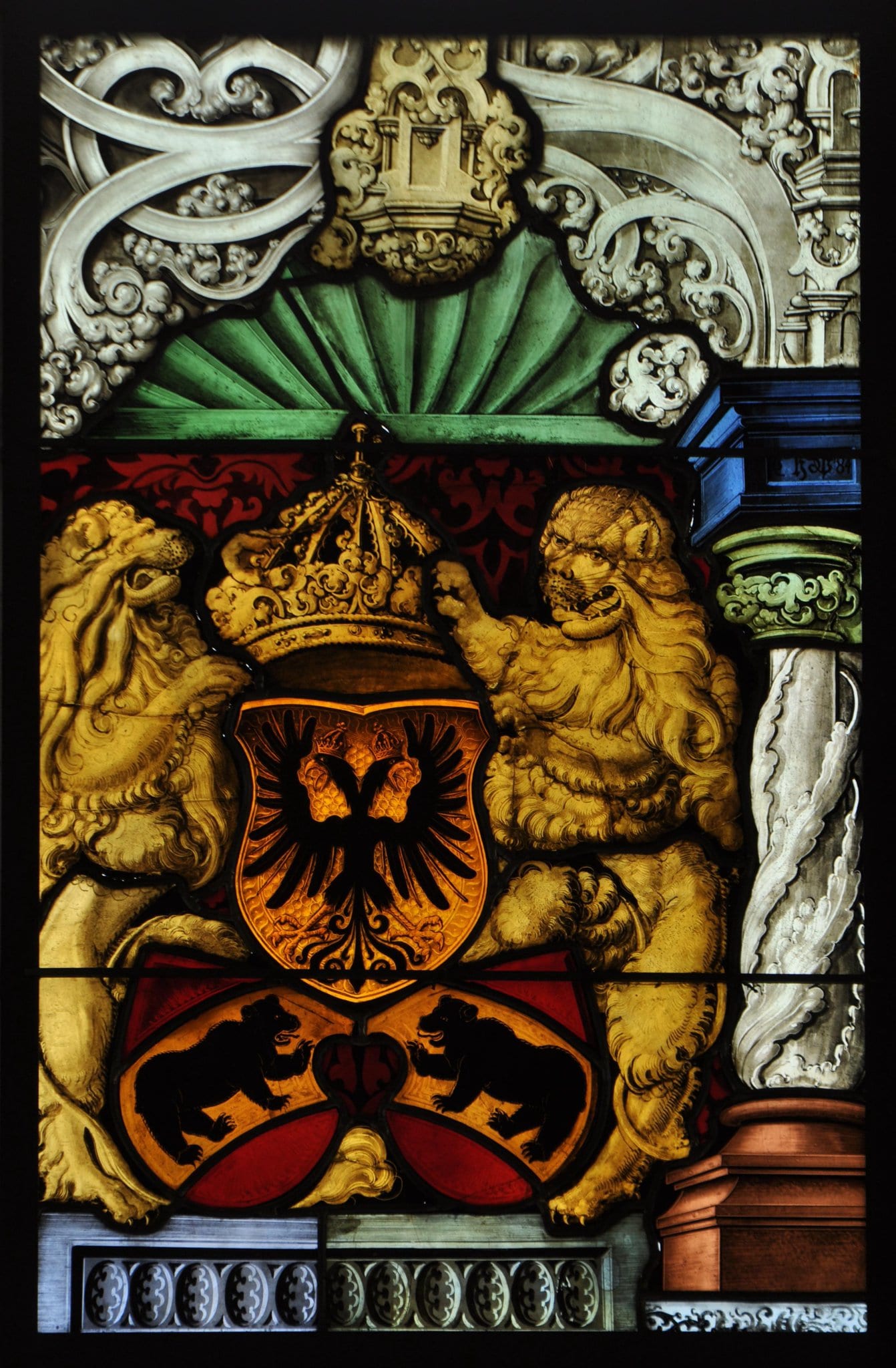 Vor rotem damasziertem Grund halten zwei Löwen über der Wappenpyramide Bern-Reich die Krone empor. Die Scheibe bildet das Gegenstück zu derjenigen mit dem hl. Vinzenz. Diese beiden Glasgemälde sind als Gesamtkomposition in einer Architekturrahmung aus blattumrankten Säulen zusammengefasst. Auf rostbraunen Basen ruhend, tragen dieselben blaue Gebälkstücke. Darüber rankt sich um zwei muschelförmige Gewölbefelder verschlungenes spätgotisches Rollwerk mit Blattschmuck.
