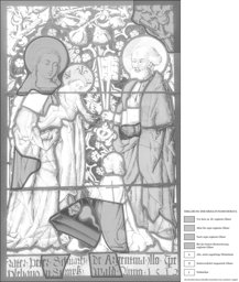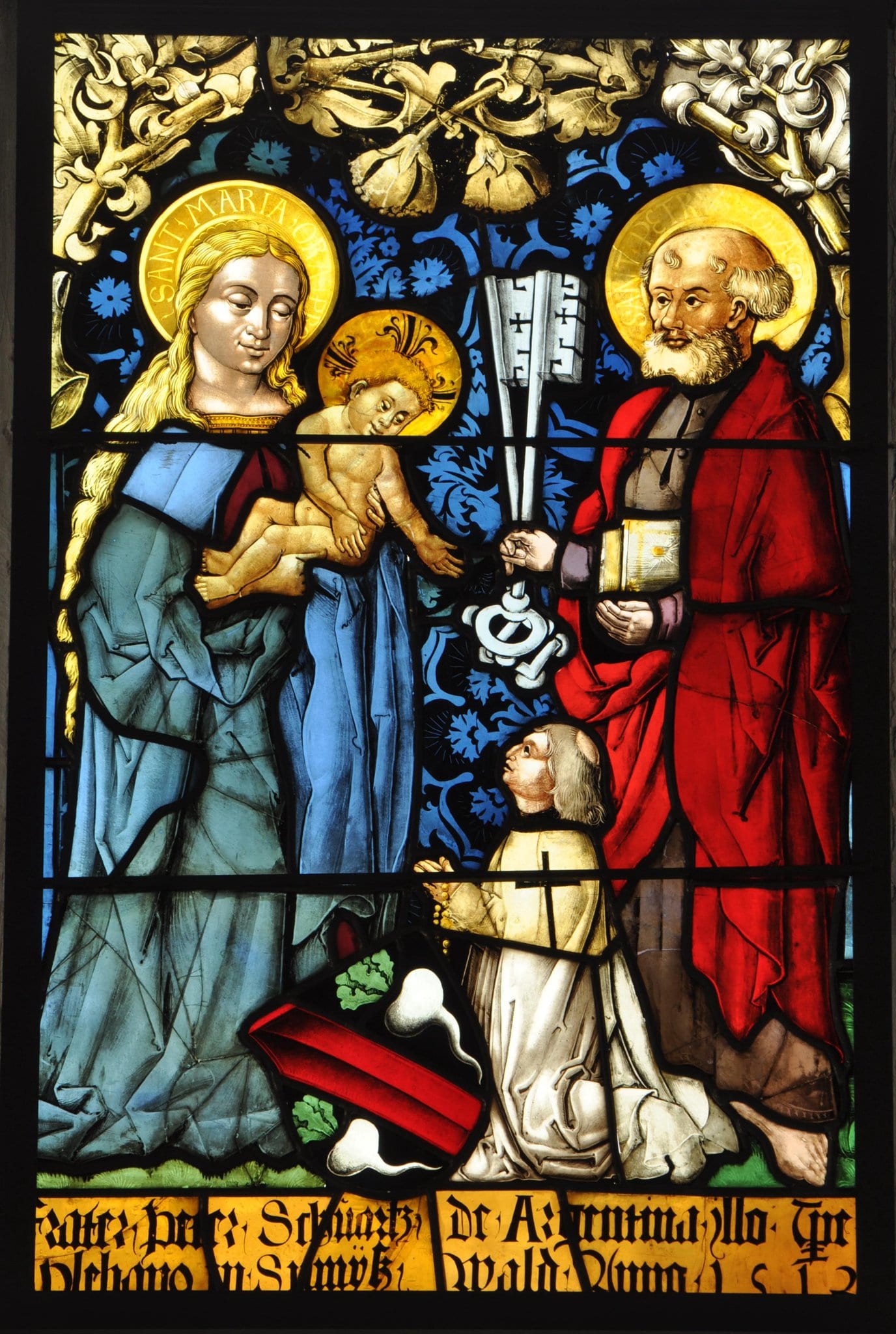 Über seinem Wappenschild den Rosenkranz in den Händen haltend, kniet Sumiswalds Deutschordensleutpriester Peter Schwarz andächtig vor der Muttergottes, der Patronin seiner Kirche. Der hl. Petrus, sein Namenspatron, steht ihm schützend und empfehlend zur Seite. Der Stifter ist tonsuriert und in den weissen Deutschordensmantel gekleidet. Von den beiden vor blauem Damastgrund auf grünem Rasen stehenden Heiligen trägt Maria einen langen blauen Mantel. Das Jesuskind auf ihren Armen beugt sich liebevoll zum Stifter hinab. Der Apostel Petrus in violettem Gewand und rotem Mantel hält in seinen Händen Buch und Schlüssel. Über den Figuren wölbt sich ein gelber Astbogen mit Blattwerk. Am Scheibenfuss nimmt ein gelber Streifen die Stifterinschrift auf.