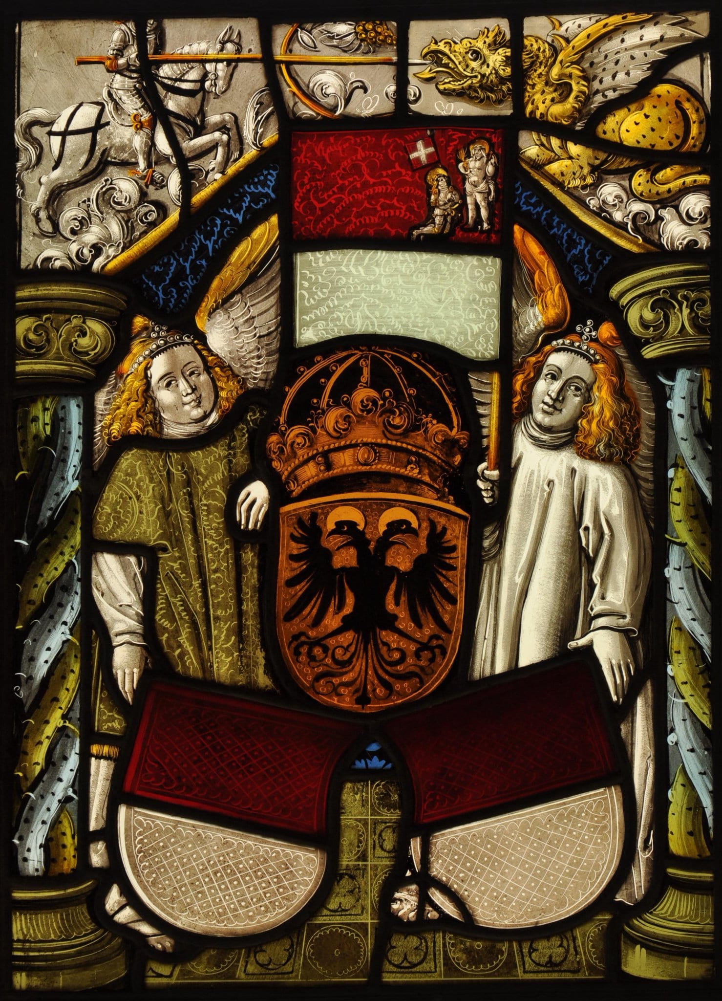 Vor blauem Damastgrund erhebt sich die bekrönte Wappenpyramide Solothurn-Reich. Sie wird von zwei auf Fliesenboden stehenden Engeln gehalten. Von diesen trägt derjenige links über seiner Alba eine damaszierte, sandfarbene Dalmatika. Sein lediglich in eine Alba gekleideter Gefährte hält in der Rechten das Solothurner Banner, dessen Eckquartier den hl. Ursus kniend vor Christus in Gestalt des Ecce homo zeigt (analog zum 1512 von Papst Julius an Solothurn verliehenen Banner). Engel und Wappen rahmen seitlich zwei aus gewundenen Baumstämmchen gebildete Säulen, über die sich ein zierlicher gelber Astbogen mit Blattwerk schwingt. Das Oberbild zeigt den berittenen hl. Georg im Kampf gegen den Drachen.