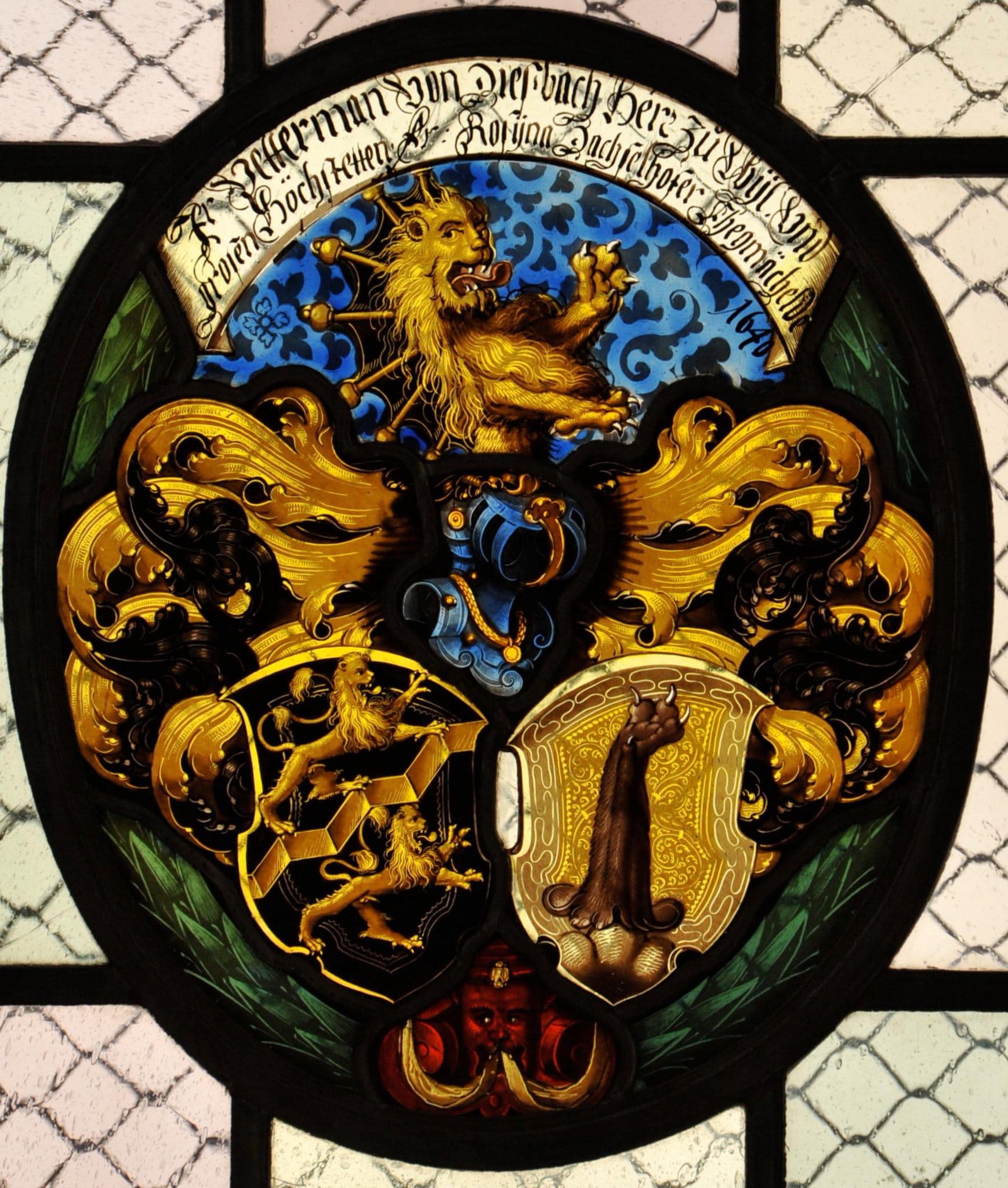Petermann von Diesbach (1614–1679), Sohn des Ludwig (1589–1648) und der Anna Rosina von Wattenwyl, war Herr zu Begnins, Cottens, und Martheray sowie 1626 Erbe der Herrschaft Wil, zu der Wil/Schlosswil, Oberhünigen und Grosshöchstetten gehörten. Er gelangte 1645 in den Grossen Rat zu Bern, wurde 1651 Vogt zu Morges und 1673 Sechzehner zu Gerbern. Petermann von Diesbach war seit 1638 mit Rosina Dachselhofer verheiratete. Nach ihrem Tod ehelichte er 1662 Magdalena von Bonstetten (* 1624), eine Tochter Rudolf von Bonstettens und Magdalena von Erlachs sowie Witwe des Johann Jakob von Ligerz. In dritter Ehe war Petermann von Diesbach mit Anna Maria Merveileux, Tochter des David und der Maria von Bonstetten verheiratet (HBLS 2/1924, S. 713; Kessel 2015). In der Kirche von Schlosswil hat sich die Grabplatte des Stifters erhalten. 1660 machte er eine Scheibenstiftung in die dort erneuerte Kirche in seiner Funktion als Herr zu Wil (Schlosswil). Sie bildet zusammen mit derjenigen seiner damaligen ersten Frau Rosina Dachselhofer eine Doppelstiftung. Beide Glasgemälde stammen aus der Hand des Berner Glasmalers Matthias Zwirn, der die Männerscheibe mit seinem Monogramm signierte. 1640 machte Petermann von Diesbach zudem die Wappengabe in die rund 10 Kilometer südlich von seinen Herrschaftsorten Schlosswil und Grosshöchstetten gelegenen Kirche Oberwichtrachs. Ob es allein nachbarschaftliche Beziehungen waren, die ihn zur Stiftung dorthin veranlassten, weiss man nicht (für die Zeit um 1640 ist keine Kirchenerneuerung bezeugt). Seine Wappengabe wurde 1745 vom Vorgängerbau in die heutige Kirche übernommen.
