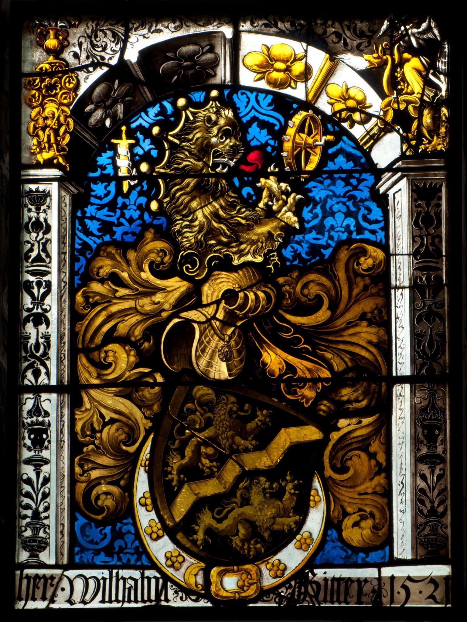 Vor blauem Damastgrund steht das Vollwappen des Wilhelm von Diesbach. Zu Seiten seiner Helmzier sind die Insignien des Ordens der hl. Katharina vom Berge Sinai (Schwert und Rad) angeordnet. Den Schild umgibt eine strenge architektonische Einfassung aus einem mit Rosetten besetzten Flachbogen und fein ornamentierten Pilastern. Der Glasmaler dürfte sich dafür an Niklaus Manuel inspiriert haben (vgl. Kat. Manuel 1979, Abb. 136). Die oberen Zwickelfelder sind mit weiteren Ordensabzeichen belegt: "Oben links die Kanne des aragonesischen Kannenordens, darunter die Kette einer Lindwurmgesellschaft und zuunterst das Abzeichen der schwäbischen Gesellschaft im Bracken (im Leithund oder Leitbracken). Oben rechts der mit dem Abzeichen der österreichischen Zopfgesellschaft verbundene Schwan des brandenburgischen Ordens oder des Schwanenordens des Herzogs von Cleve. Darunter der Drache mit dem Kreuz des Drachenordens (Gesellschaft vom Lindwurm, der wohl auch die erwähnte Kette links angehört) und der Orden des Hl. Geistes oder der Taube. Das Abzeichen des sizilianischen Ordens della Squama umrahmt den Wappenschild" (Heinz Matile, in: Kat. Manuel 1979, S. 452). Den "Gurt mit Schnalle" unter dem Wappen interpretiert Schlup (S. 292) hingegen als "Ordensband der österreichischen Zopfgesellschaft" (vgl. dazu auch die Interpretation von Ganz bei Kasser 1903, S. 26). Die gleichen Ordenszeichen finden sich auf dem Relief mit dem Wappen des Niklaus von Diesbach (1430–1475) von ca. 1470 aus dem Von-Diesbach-Haus an der Münstergasse 2 in Bern (heute im BHM Bern; HLS 3/2004, Foto S. 716). Der Stiftername befindet sich am schmalen Sockel, der sich am Scheibenfuss hinzieht.