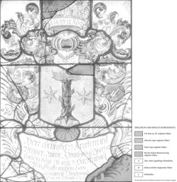 Je ein Stück im Wappen und in der Helmkrone sowie das Glasstück in der Ecke unten rechts neu ergänzt; Retuschen in der Wappenkrone; Sprungbleie; die Verbleiung erneuert.