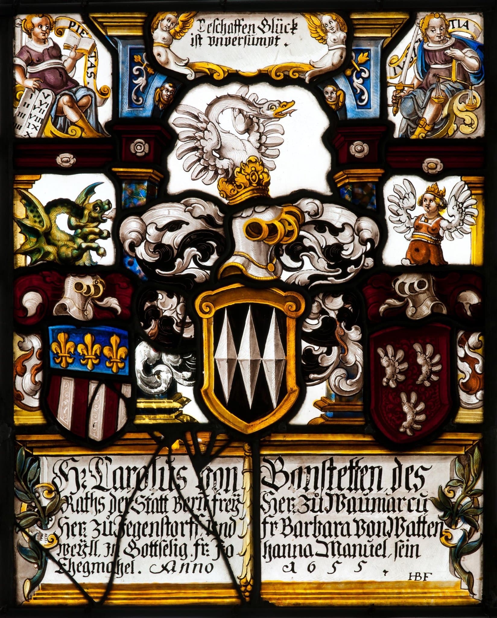 H: Carolus von Bonstetten des / Raths der Statt Bern freÿ Herr zů Waumarcu / Herr zů Jegenstorff vnd fr Barbara von Watten / weÿll, Jn Gottselig. fr: Jo hanna Manuel, sein / Ehegemahel. Anno 1655 / HB F.