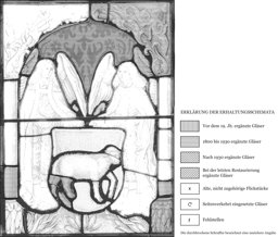 Die meisten Gläser oberhalb beider Engel, die Oberteile von deren äusseren Flügeln sowie einige Gläser unten in den Rundpfeilern und im Wappen neu ergänzt; einige Sprungbleie; die Verbleiung erneuert.