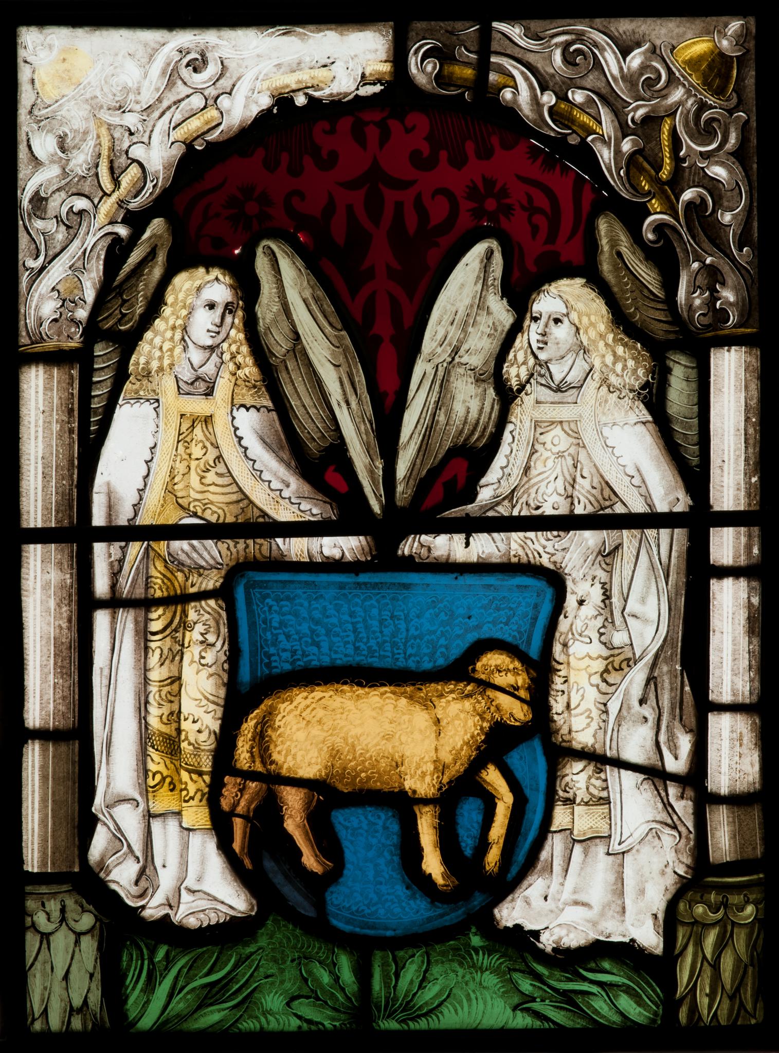 Die Scheibe zeigt vor rotem Damastgrund den auf Wiesenboden gesetzten, unbekannten Wappenschild mit der Darstellung eines schreitenden Lammes. Er wird von zwei Engeln in Diakonstracht gehalten. Über die rahmenden Rundpfeiler schwingt sich ein Astbogen mit Blattwerk.