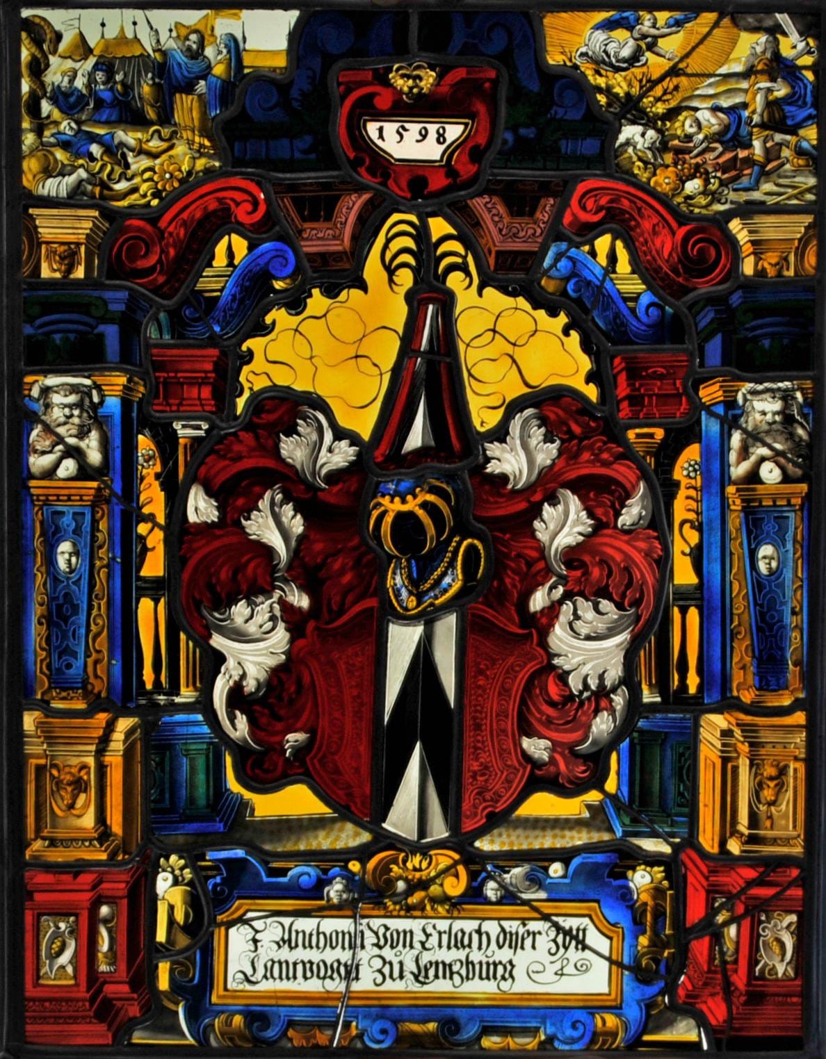 Nach den Angaben zum Foto des Schweizerischen Nationalmuseums in Zürich soll das Glasgemälde des Anton von Erlach von Samuel Sybold stammen. Die mit Sybold in Verbindung gebrachten Werke weisen dazu jedoch ebenso wenig enge Stilbezüge auf wie diejenigen anderer gegen Ende des 16. Jahrhunderts in Bern nachgewiesener Glasmaler (Hans Huber, Mathis Walther, Thüring Walther, Hans Zeender, Hans Jakob Hübschi etc.). Man kann sich deshalb fragen, ob Anton von Erlach die Scheibe in der Werkstatt eines in der Nachbarschaft von Lenzburg gelegenen Ortes wie Aarau, Brugg oder Zofingen in Auftrag gab. Zieht man die Arbeiten zum Vergleich heran, welche die damals dort tätigen Glasmaler wie Durs Hunziker in Aarau, Simon Schilpli in Brugg oder Peter Balduin und seine Söhne in Zofingen schufen, dann muss man allerdings feststellen, dass sich auch darunter keine wirklich eng verwandten Stücke finden.