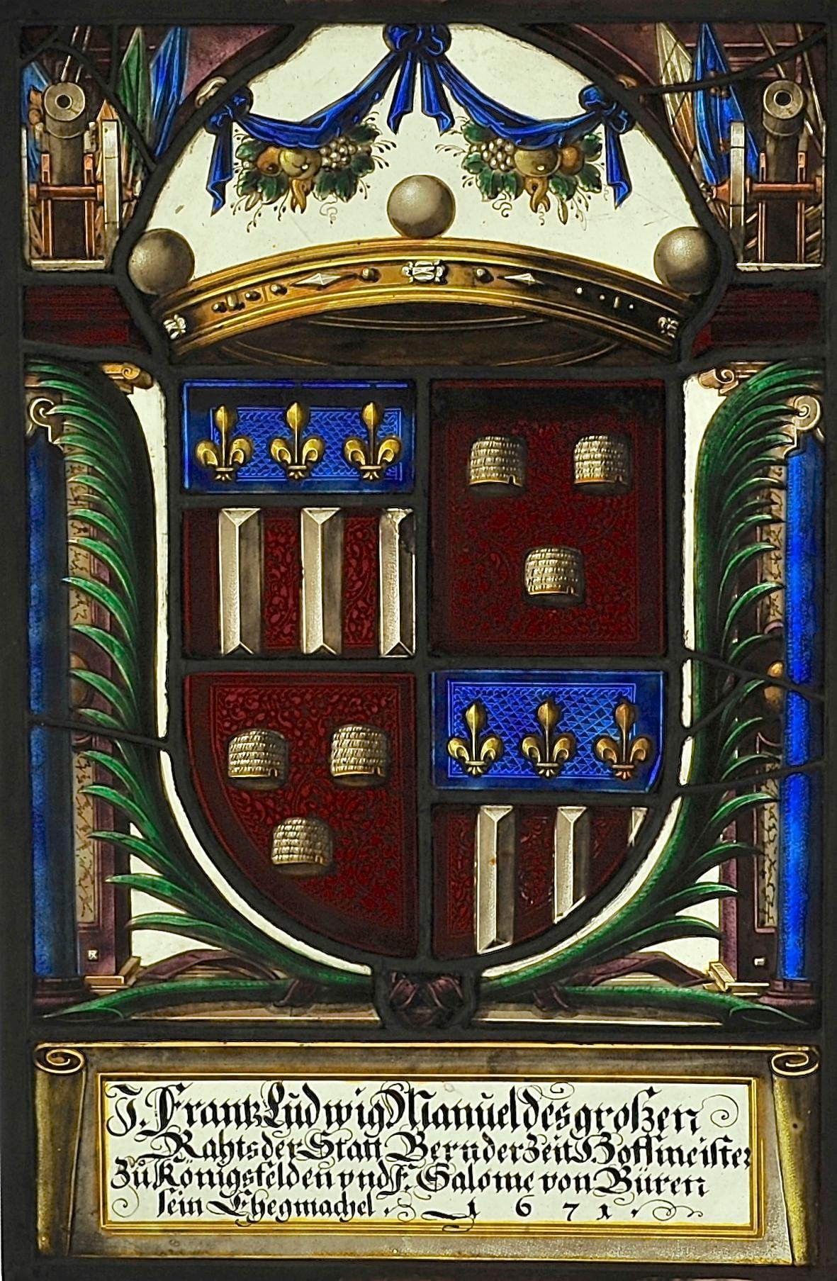 Aufgrund stilistischer Vergleiche muss es sich bei Franz Ludwig Manuels Allianzscheibe um ein besonders imposant komponiertes Stück unbekannter Hand aus dem Umkreis des Berner Glasmalers Hans Jakob Güder handeln. Von diesem unterscheidet sich der Schöpfer des vorliegenden Werks durch seine kühlere Malweise und die ausgesprochen exakten gradlinigen Buchstaben mit kleinen Häkchen am oberen und unteren Rand.