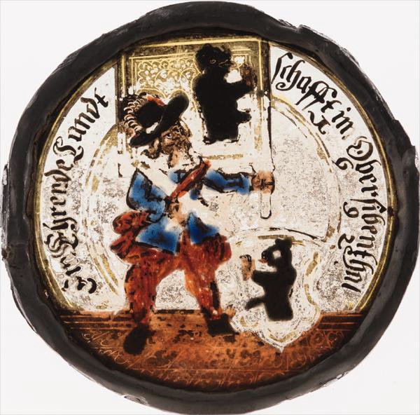 Vor farblosem Grund steht breitbeinig der bärtige Bannerträger der Landschaft Obersimmental auf einem rötlichen Fliesenboden. Er ist in ein blaues Obergewand und braune Hosen gekleidet und trägt einen schwarzen Federhut. Zu Füssen der von der Stifterinschrift umfassten Figur ist der Wappenschild Obersimmentals angebracht.