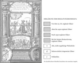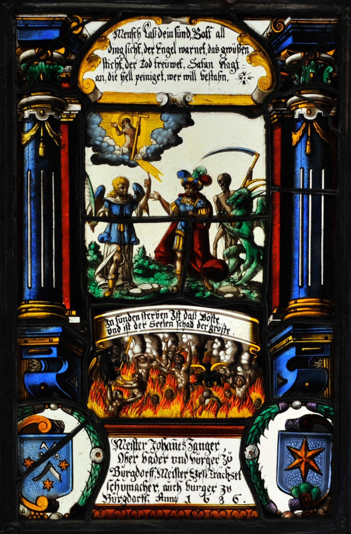 Ein Jüngling in blauem Brustpanzer, Waffenrock, Federhut und rotem Mantel verkörpert den um sein Heil ringenden, am Scheideweg stehenden Menschen. Während sich ihm von hinten der vom senseschwingenden Tod begleitete Teufel in grüner Bocksgestalt nähert, wendet er sich dem Engel vor ihm zu. Dieser weist ihn auf Christus, der am Himmel in einem wolkenumkränzten Strahlenkranz als Halbfigur mit dem Siegeskreuz erscheint. Den Gegenpol dazu bilden die Verdammten im Höllenfeuer unterhalb der umkämpften jungen Seele. Erläutert wird die allegorische Darstellung durch die beiden Bildlegenden, die im Bogenfeld oberhalb der Hauptfiguren und im Schriftband über den Verdammten festgehalten sind. Seitlich gerahmt wird das Figurenbild von roten Pfeilern mit vorgesetzten blauen, kannelierten Säulen. In den unteren Bildecken befinden sich die oval umkränzten Wappen der beiden Stifter und dazwischen in einer Tafel deren Namen.