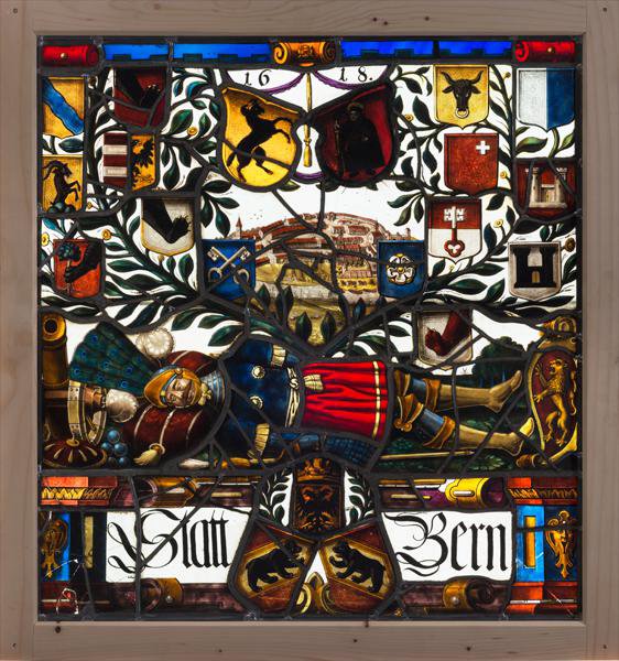 Die Figur des Berner Stadtgründers Herzog Berchtolds V. von Zähringen ist in blauem Harnisch und rotem Waffenrock zwischen einer Kanone mit ihrer Munition und dem Schild mit dem Zähringer Wappen liegend auf dem Podium festgehalten. Aus ihr hervor wächst der Ämterbaum, der ausser den Wappen der bernischen Ämter Erlach, Aeschi, Nidau, Brugg und Weissenburg mehrere nicht zum Originalbestand gehörende Wappen (neben unbekannten jene der eidgenössischen Stände Schaffhausen, Glarus, Uri, Schwyz, Unterwalden) umfasst. Innerhalb des Baumes erscheint eine Stadtansicht Berns. Das beschriftete Podium enthält im Zentrum die bekränzte Wappenpyramide Bern-Reich.