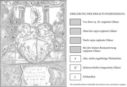 Das Volllwappen des Hans Jakob Dübelbeiss steht vor einer dreiachsigen Pfeilergalerie. Begleitet wird es von zwei allegorischen Frauengestalten. Die in eine rote Tunika gekleidete Figur rechts mit dem goldenen Mond auf dem Kopf, dem Bogen in der Hand und dem Hund zu ihren Füssen repräsentiert die römische Jagd- und Mondgöttin Diana (griech. Artemis). Ihr Gegenüber ist durch Flickstücke stark verunstaltet. Der diese Figur auszeichnende Helmschmuck sowie Eule und Buch zu ihren Füssen lassen aber vermuten, dass es sich um Athena (röm. Minerva), die Göttin des Krieges, des Friedens und der Weisheit handelt. Die Stifterinschrift befindet sich in der am Scheibenfuss zwischen Kanonen und weiteres Kriegsgerät gesetzten Rollwerkkartusche.