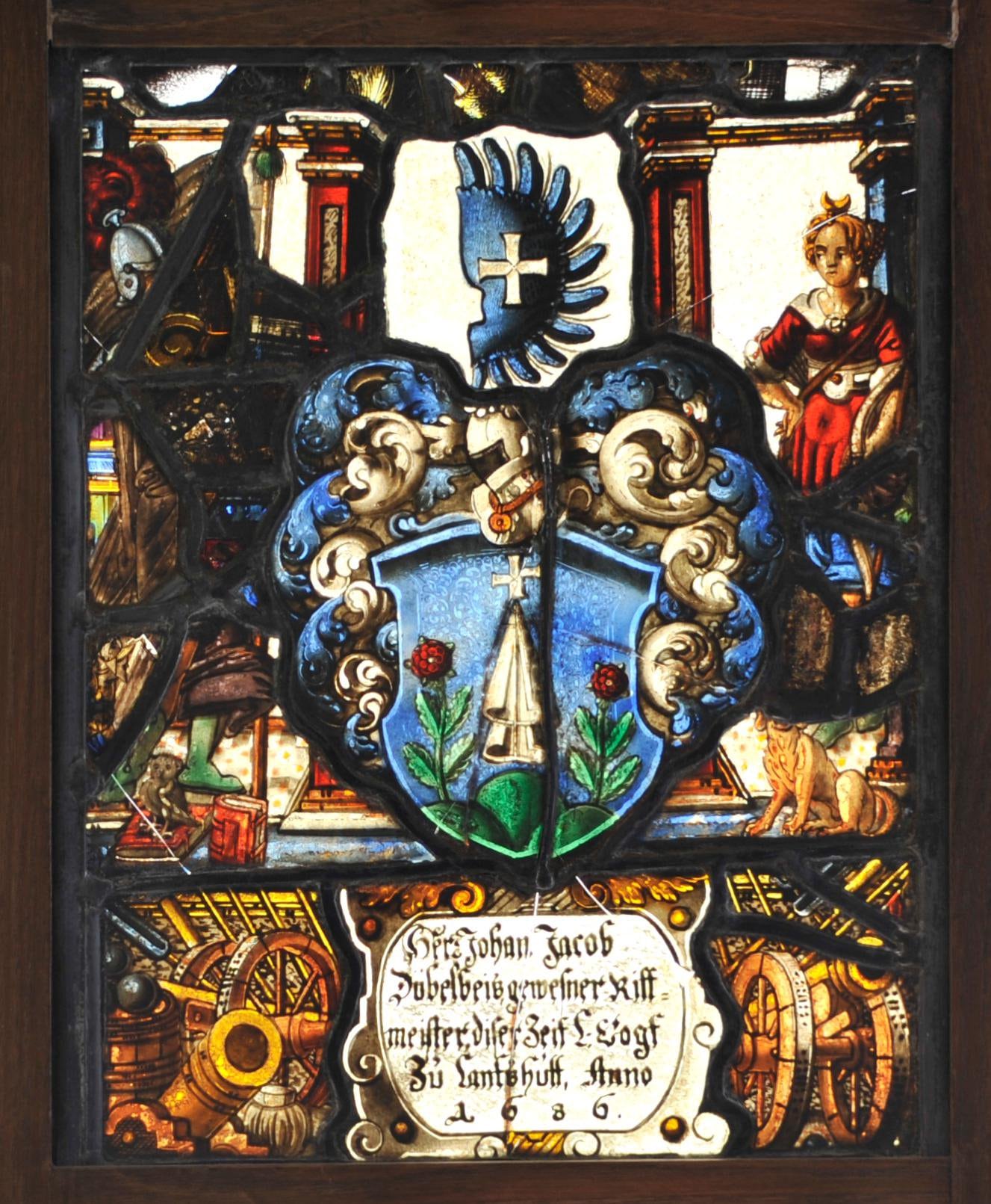 Herr Johan Jacob / Dübelbeiβ gewesner Ritt= / meister, diser Zeit L:Vogt / Zu Lantβhutt, Anno / 1686.