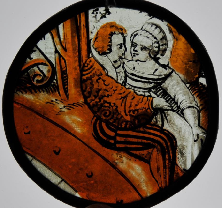 Das Fragment zeigt ein an einen Baum gelehntes Liebespaar, das auf einem Bogen zu sitzen scheint. Es könnte sich demnach um das in Rundform gebrachte rechte Oberbildeckstück einer Scheibe handeln, deren Hauptfeld eine Bogenarchitektur umrahmte.