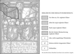 Das Glas mit der Helmzier von Wattenwyl und den anschliessenden Kapitellen neu ergänzt; Sprungbleie; die Verbleiung erneuert.