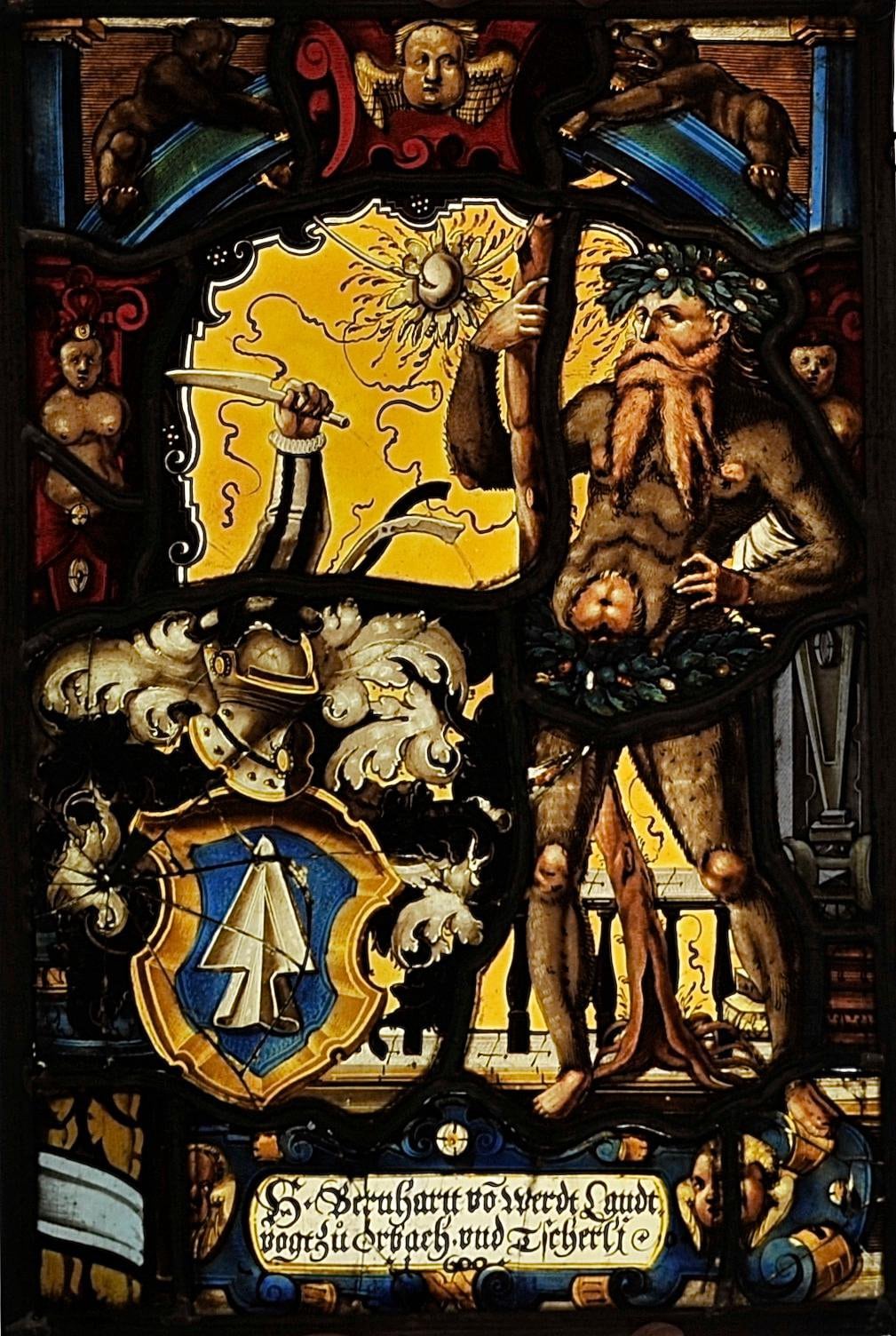 Vor schnurverziertem gelbem Grund und einer niedrigen Balustrade erscheint das Vollwappen des Bernhard von Werdt in Begleitung eines Wildmannes, der auf dem Kopf und um die Hüften mit Blättern bekränzt ist und in seiner Rechten einen Baumstamm hält. Dahinter erhebt sich eine Arkade aus zwei roten, mit Hermen verzierten Pfeilern und einem blauen Bogen, auf dem zwei Bären liegen. Den Bogenscheitel schmückt eine rote Kartusche mit Engelskopf. Zwei weitere Engelsköpfe befinden sich unten am Podium zu Seiten der Inschriftentafel (davon ist der linke nur fragmentarisch erhalten).