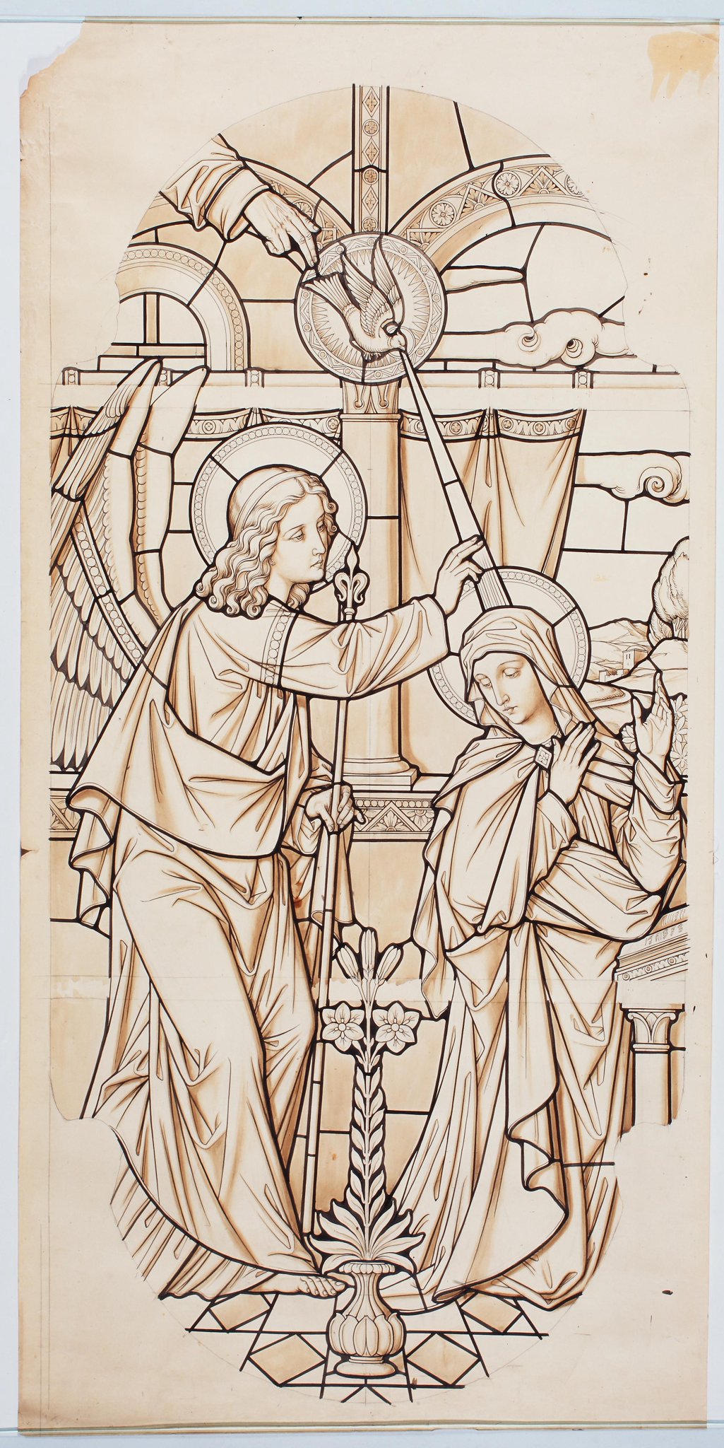 L’archange Gabriel, à gauche, fait un signe de bénédiction sur la tête de la Vierge, agenouillée à droite et représentée de trois quarts. Surprise, elle ouvre ses mains devant elle et se retourne vers Gabriel En haut, la main de Dieu touche de deux doigts le nimbe où se trouve la colombe du Saint-Esprit qui envoie un rayon de lumière sur la Vierge. A l’arrière-plan une architecture, avec une colonne au centre et une tenture partiellement ouverte sur la droite, dévoile un paysage dans lequel on découvre une maison au loin. Au premier plan au centre, un lys se dresse dans un vase posé à même le sol composé de carreaux => d’un dallage.