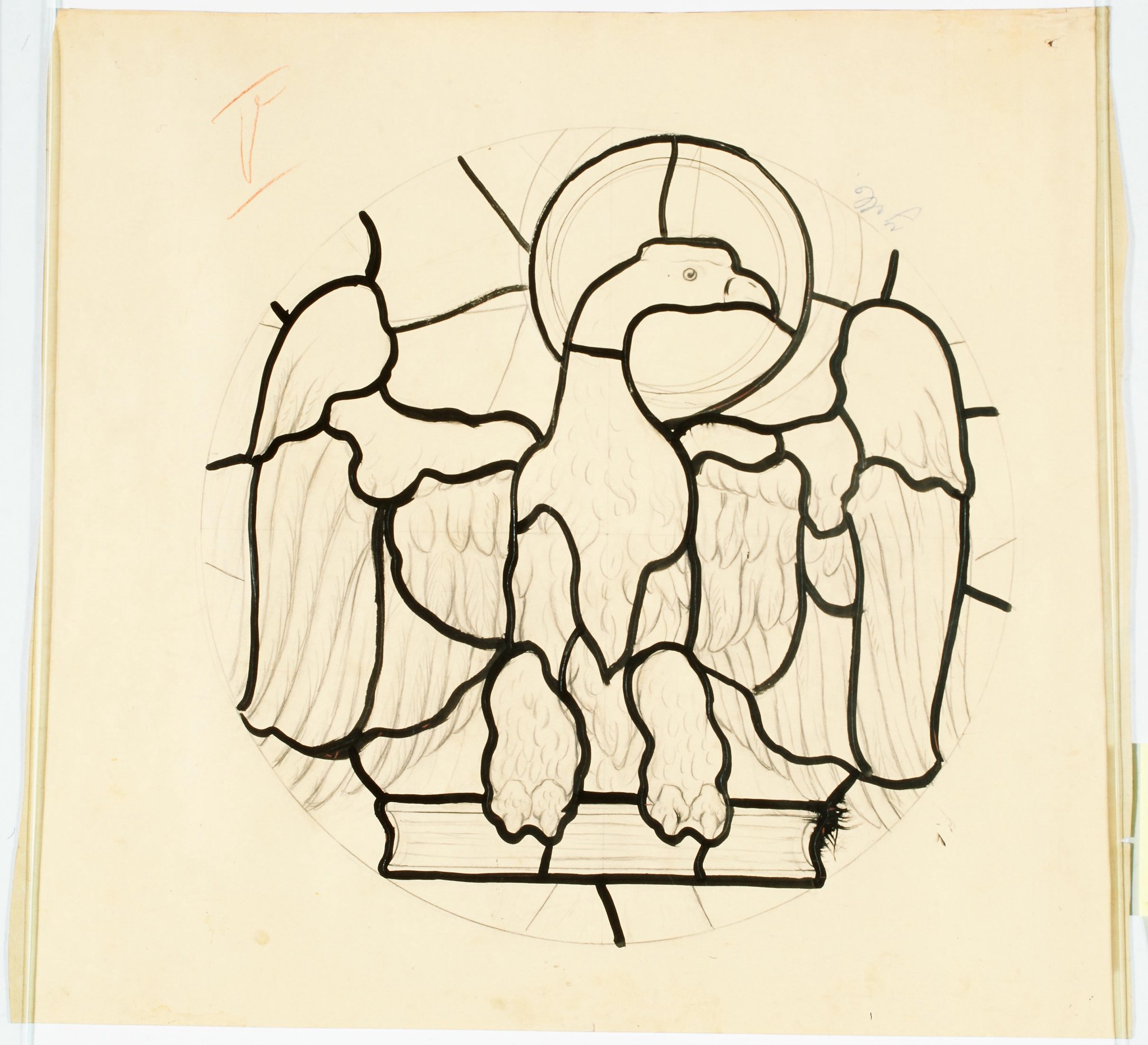 Ce carton en noir et blanc est le modèle précis à l’échelle 1:1 du médaillon au sommet de la troisième fenêtre à double lancette située dans la nef à droite de l’église Saint-Jean-Baptiste à Grolley. Bien que l’ensemble des cartons illustrant les médaillons pour les vitraux de la nef ne soient pas signés, nous pouvons dire qu’ils sont très certainement de la main de l’artiste Raymond Buchs.