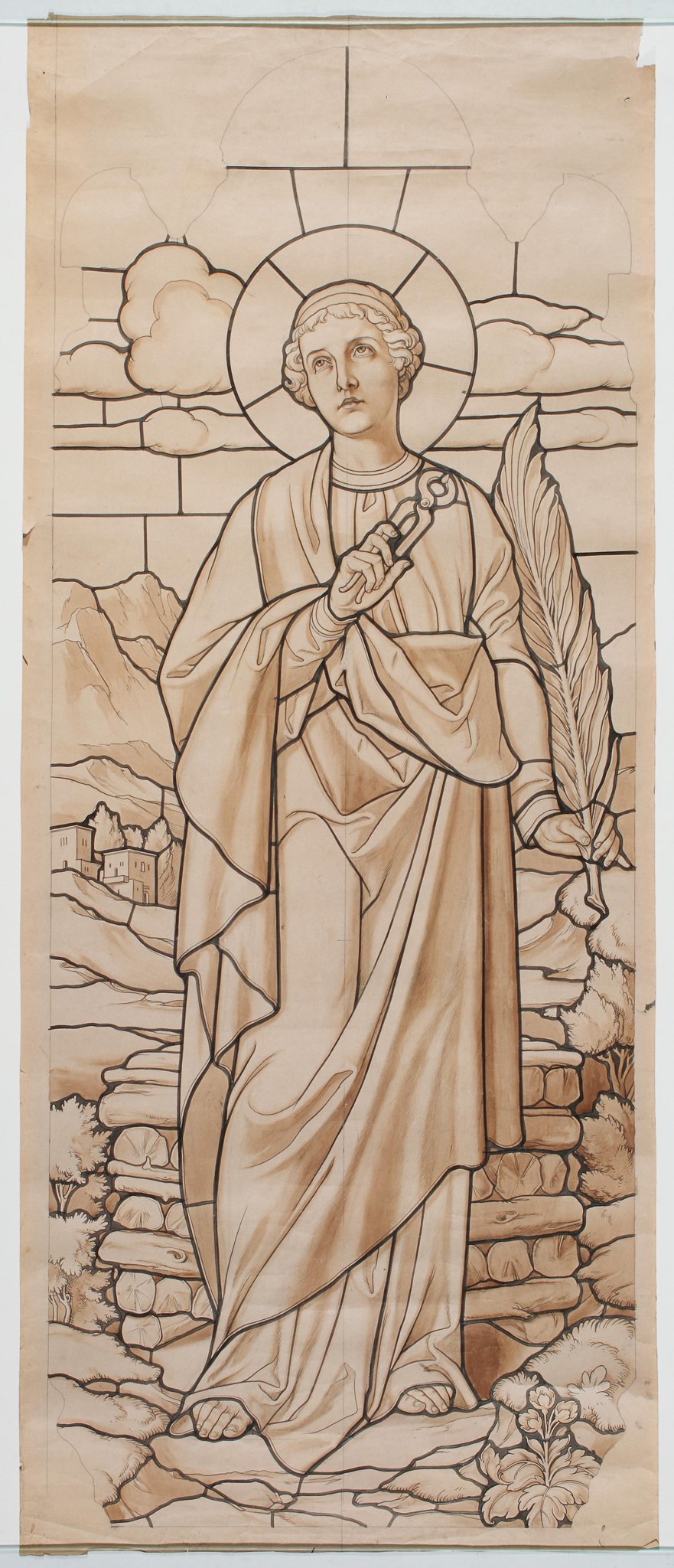 Ce carton, en noir et blanc, est le modèle précis et à l’échelle 1:1 de la partie figurée du vitrail consacré à sainte Appoline pour le troisième fenêtre à gauche dans la nef de l’église Saint-André à Onnens. Toute la partie décorative manque mais la forme trilobée de l’ouverture est indiquée. avec précision.