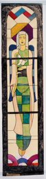 Ce carton en couleur est le modèle précis à l’échelle 1:1 de la partie inférieure du vitrail consacré au Baptême du Christ, Christ en discussion avec les docteurs et la Présentation du Christ au temple pour la deuxième fenêtre à gauche dans la nef de la chapelle Notre-Dame de la Paix à l’église Sainte-Thérèse dans le quartier de Champel à Genève.