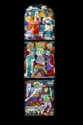 Ce carton en couleur est le modèle précis à l’échelle 1:1 de la partie supérieure du vitrail consacré aux Rois mages, la Nativité et les bergers pour la troisième fenêtre à gauche dans la nef de la chapelle de la Paix à l’église Sainte-Thérèse dans le quartier de Champel à Genève.