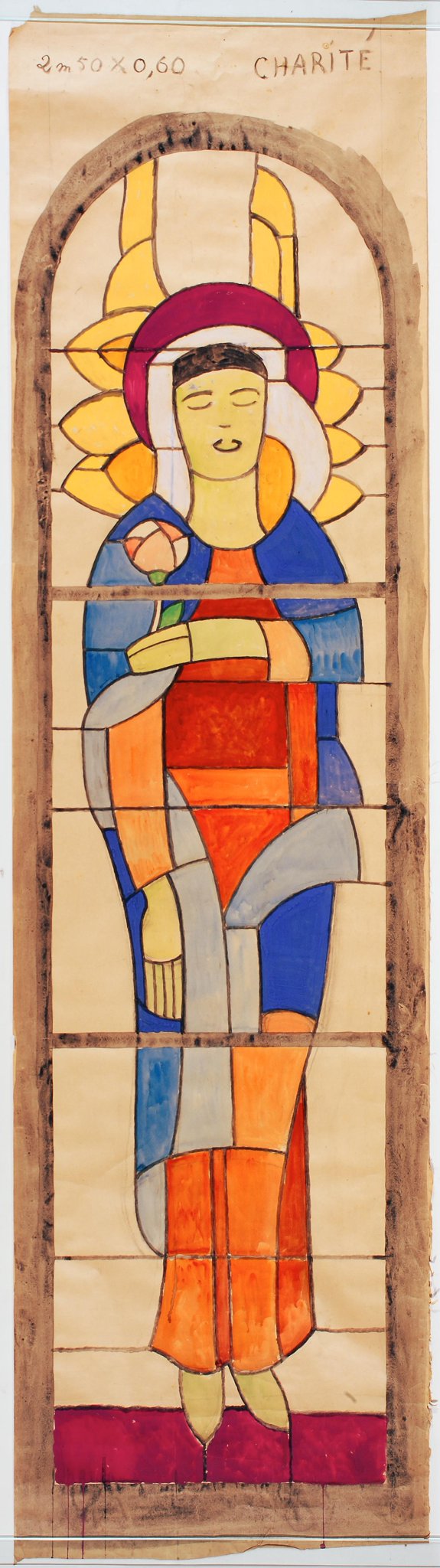 Ce carton en couleur est le modèle à l’échelle 1:1 d’un vitrail consacré à la Charité qui pourrait avoir été imaginé pour l’une des fenêtres hautes de la nef de l’église Sainte-Thérèse dans le quartier de Champel à Genève selon les indications écrites sur un bout de carton déchiré (aujourd’hui disparu mais mentionné dans l’inventaire par Augustin Pasquier) accompagnant un rouleau de cartons pour Sainte-Thérèse. Les dimensions mentionnées sur ce carton semblent concorder avec la taille de l’ouverture des fenêtres hautes de la nef. En date du 3 janvier 1949, Castella envoie au curé Carlier de la paroisse Sainte-Thérèse de Genève quelques cartons pour ces hauts-jours (voir inscription au verso du KF_1028). Nous ne connaissons pas les raisons pour lesquelles ce projet n’a pas abouti mais une des plus probables est que Castella quitte la Suisse pour retourner en Australie au cours de cette année 1949. Finalement ces hauts-jours n’ont pas été parés de vitraux.