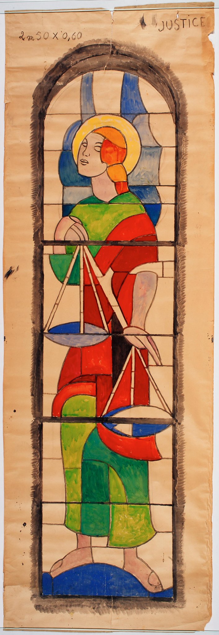 Ce carton en couleur est le modèle à l’échelle 1:1 d’un vitrail consacré à la Justice qui pourrait avoir été imaginé pour l’une des fenêtres hautes de la nef de l’église Sainte-Thérèse dans le quartier de Champel à Genève selon les indications écrites sur un bout de carton déchiré (aujourd’hui disparu mais mentionné dans l’inventaire par Augustin Pasquier) accompagnant un rouleau de cartons pour Sainte-Thérèse. Les dimensions mentionnées sur ce carton semblent concorder avec la taille de l’ouverture des fenêtres hautes de la nef. En date du 3 janvier 1949, Castella envoie au curé Carlier de la paroisse Sainte-Thérèse de Genève quelques cartons pour ces hauts-jours (voir inscription au verso du KF_1028). Nous ne connaissons pas les raisons pour lesquelles ce projet n’a pas abouti mais une des plus probables est que Castella quitte la Suisse pour retourner en Australie au cours de cette année 1949. Finalement ces hauts-jours n’ont pas été parés de vitraux.