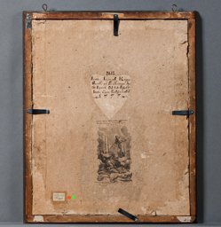 Als Unterlage einseitig geschwärztes Makulatur-Papier, auf dem einige Farben des Bildes haften blieben, darunter ungeschwärztes Büttenpapier mit unidentifiziertem Wasserzeichen. Hinterlage aus Karton, aussen und innen mit Besitzerangabe, Inv.-Nr. und Jahr beschriftet, innen mit dem Zusatz: ora . pro . Me Pecatore.