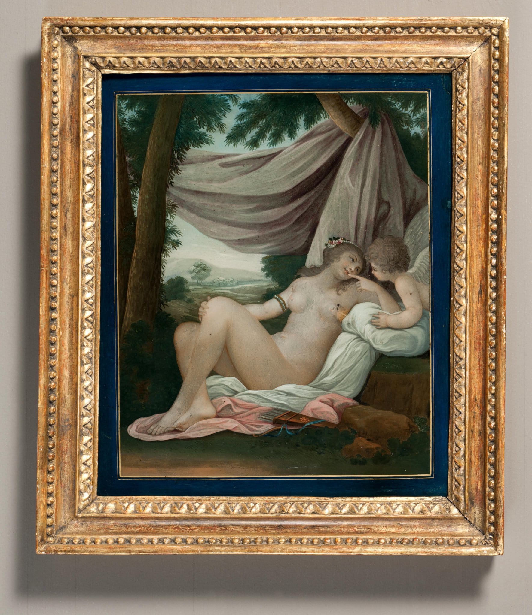 Unter schweren hellrot verblassten Draperien, die an Bäumen befestigt sind, liegt Venus halbaufgerichtet nackt auf weissen und roten Stoffbahnen. Sie trägt im hellbraunen Haar mit Ringellocke ein Blumendiadem, an ihrem rechten Oberarm ein Schmuckband. Von rechts neigt sich, auf Kissen gestützt, der geflügelte Amor zu ihr, die sich zurückwendet und sinnend ihren Zeigefinger an die Lippen führt. Vor ihnen liegen der Köcher mit Pfeilen und der Bogen. Hinten öffnet sich der Blick auf eine Flusslandschaft.