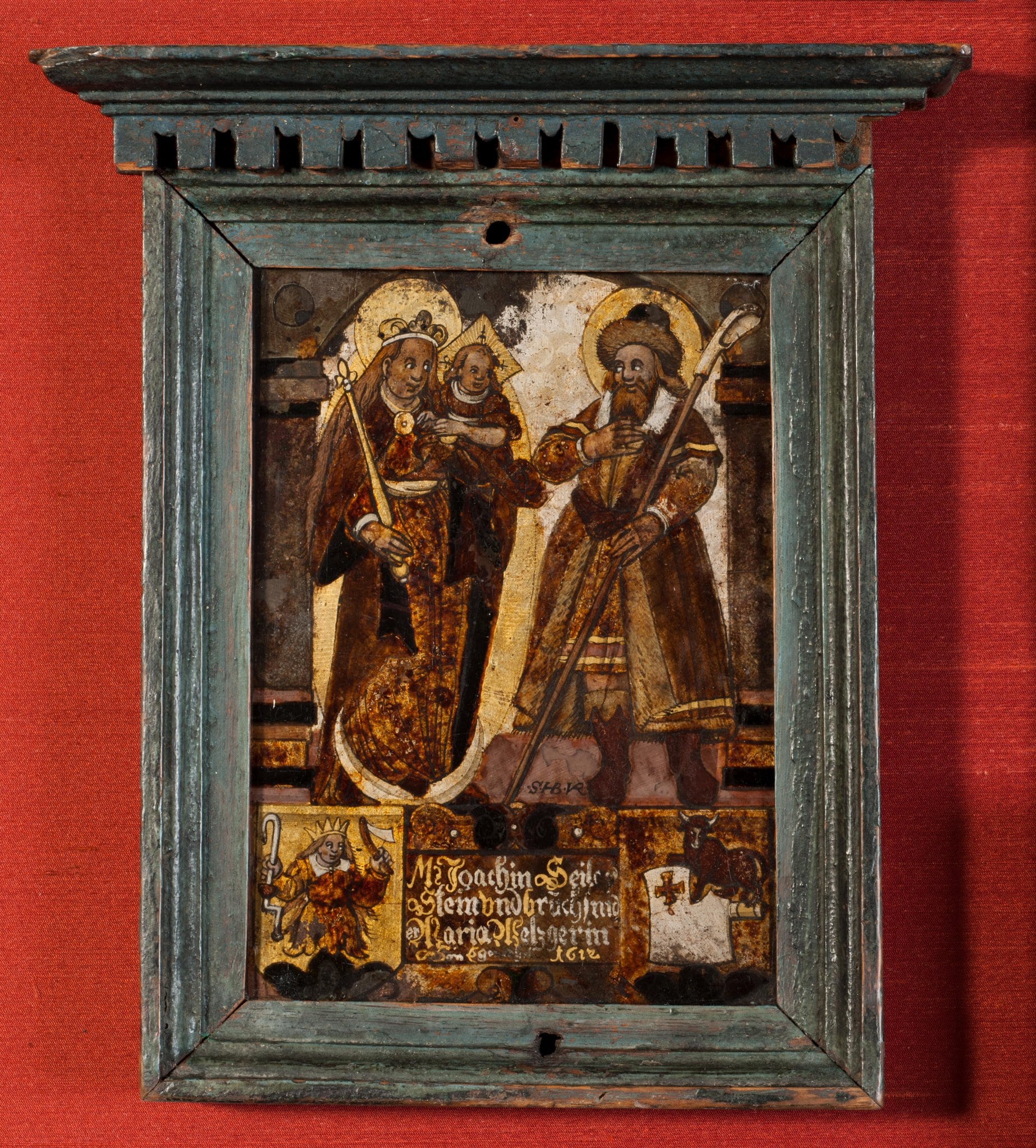 Unter einer flachbogigen Renaissance-Arkade stehen links Maria in einer Strahlenmandorla als Himmelskönigin mit Krone und Szepter, das Jesuskind auf dem Arm tragend, rechts der hl. Joachim als bärtiger Hirte mit hohen Stiefeln, weitem Mantel und breitkrempigem Hut, den langen Hirtenstab in der Hand. Unter den beiden Figuren befindet sich in der Mitte die Stifterinschrift. Links steht das Wappen des Stifters: in Gold auf grünem Dreiberg eine wachsende Jungfrau in rotem Kleid mit goldener Krone, in der Rechten den Chirurgenbohrer, in der Linken das Klappmesser haltend (Seiler). Rechts ist das sprechende Wappen seiner Gattin erkennbar: in Rot ein silbernes Metzgerbeil mit goldenem Griff, darauf im linken Obereck ein natürlicher Ochse mit silbernen Hörnern (Metzger).