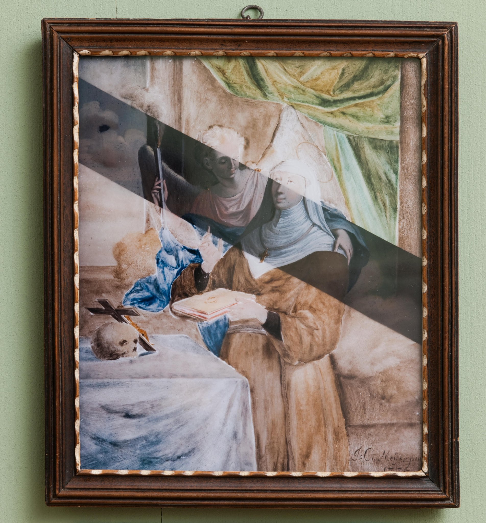In einem Innenraum mit grüner Draperie erscheint ein in Wolken schwebender Engel mit brennender Kerze der stehenden Heiligen am Hausaltar, auf dem Totenkopf und Kruzifix liegen. Die nimbierte heilige Theresa von Avila trägt das braune Ordensgewand mit weissem Wimpel und Schleier sowie ein Brustkreuz. Sie hat ihre Lektüre im Buch unterbrochen und blickt lauschend nach oben, den Eingebungen des Engels folgend.