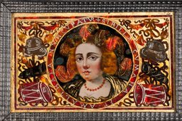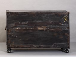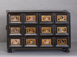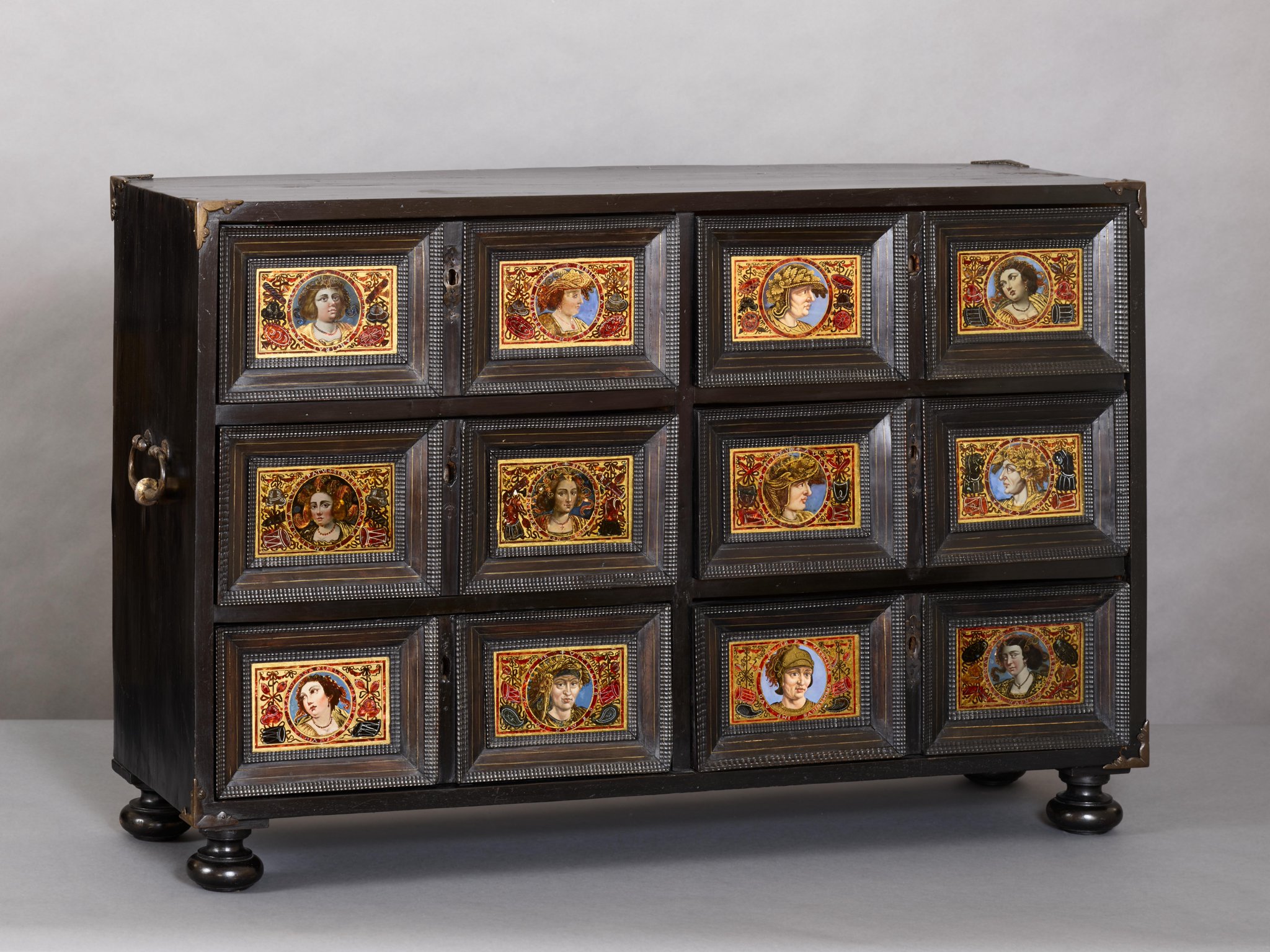 Der breitgelagerte, auf gedrückten Kugelfüssen ruhende ebenholzfurnierte Kabinettschrank weist sechs symmetrisch angeordnete, verschliessbare Schubfächer auf, deren Fronten je zwei Hinterglasbilder zieren. Die Bildumrahmungen aus Wellleisten mit eingelegtem Zinndraht zeigen ohne erkennbares System der Anordnung fünf Cäsaren- und sieben Sibyllenköpfe (die untere linke Einlage als Ersatz für ein verlorenes Original). Sie stellen von oben links nach unten rechts dar: Sibylla Phrygica und Samia, Julius Caesar und Sibylla Tiburtina, dann Sibylla Cumana und Libyca, Augustus und Galba, schliesslich Sibylla Tiburtina (Kopie) und Vitellius, sowie – in anderer Darstellung – nochmals Vitellius und Sibylla Persica. Die prallen Gesichter erscheinen in Rundmedaillons, die von einer umlaufenden Inschrift und Trophäen mit Girlanden und Bandelwerk umgeben sind. Der Schrank besitzt Eckzierden und an den Seiten Tragegriffe aus Bronze.