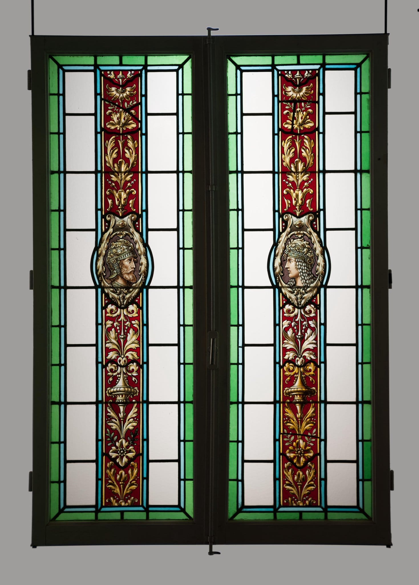 En l’absence de signature, aucune attribution certaine à un atelier et aucune datation précise de cette fenêtre ne peuvent être faites. La majeure partie des vitraux Art nouveau de la ville datent entre 1895 et 1917, période d’apogée économique et commerciale (Hoffmann, 2006, p. 44). Le style est éloigné du “style sapin” qui s’est développé dans la région sous l’influence de Charles l’Eplattenier et à travers l’Ecole d’art qu’il a réorganisée entre 1904 et 1905, jouant un rôle important dans la diffusion des arts décoratifs et participant à la décoration de plusieurs bâtiments (Moser, 1990, p. 82). Le style de notre fenêtre s’approche davantage de la production des ateliers zurichois actifs dans la ville, Karl Wehrli ou Huber-Stutz (Moser, 1990, p. 86), ou encore Franz Xaver Zettler, de Munich (cf. Hoffmann, 2006, p. 58-62). Les vitraux provenant de l’immeuble Terreaux 18 ont été publiés par la ville de La Chaux-de-Fonds dans le calendrier 2002 (mois de septembre). La fenêtre exposée (N°inv. VMR 119_121) a un pendant (N°inv. VMR 461), reprenant fidèlement les mêmes frises verticales néo-renaissantes et les mêmes cartouches avec profils se faisant face. Trois autres battants néo-renaissants avec un encadrement ornemental plus géométrique et des cartouches rectangulaires avec portraits de profils (N°inv. VMR 458, 459 et 460), ainsi que deux battants plus simples avec un médaillon circulaire encadrant des portraits idéalisés (N°inv. VMR 118 et 120) décoraient le même immeuble.