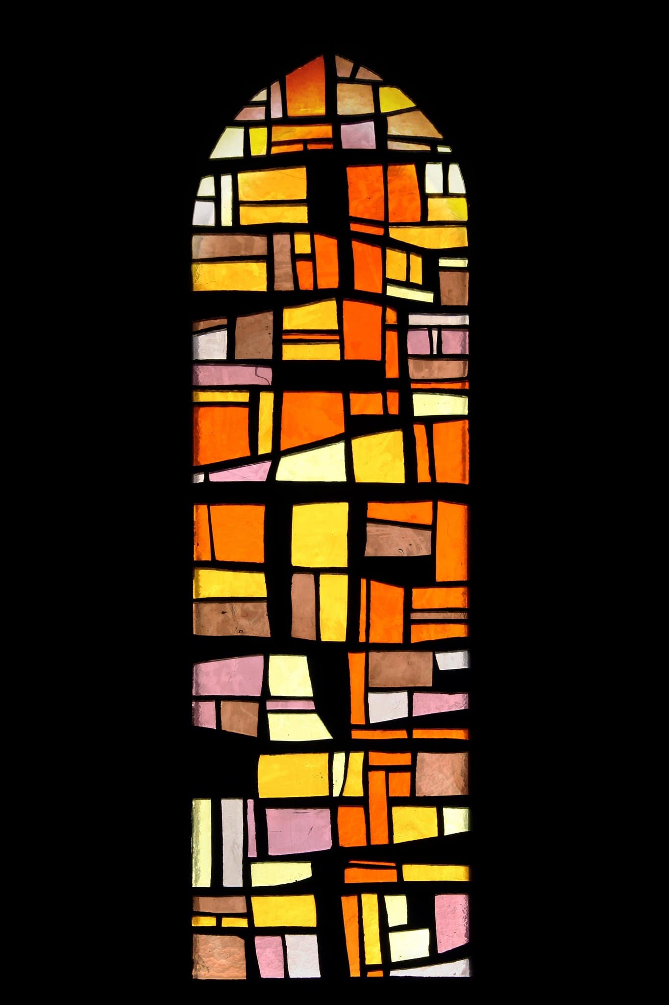 Vitrail non figuratif composé de verres aux couleurs chaudes (orange, jaune, brun).